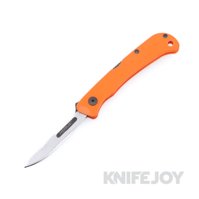 The Hogue Expel is an orange G10-handled folding scalpel built on a 416 stainless steel frame with a replaceable high-carbon steel blade. It measures 7 inches overall with a 2.5‑inch scalpel blade and weighs only about 1.5 oz. The dual‑action flipper tab functions as both a blade ejector and deployment lever, allowing safe, one‑handed removal and replacement of the included #60‑ and #70‑style blades. A spine lock secures the blade during use, while peel‑ply textured G10 scales, a deep‑carry pocket clip, and a lanyard hole provide grip and carry options. This precision folding scalpel excels at slicing through tape, plastic, and cardboard, and its easy blade changes ensure a razor‑sharp edge good all day long.