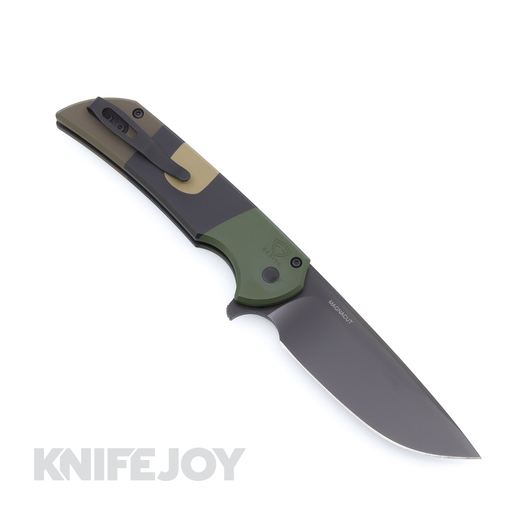 This Mordax KnifeJoy Exclusive M81 Camo edition has a unique Cerakote aluminum handle, Black DLC coated Magnacut blade, black hardware, black Mother Of Pearl button and black titanium deep carry clip.