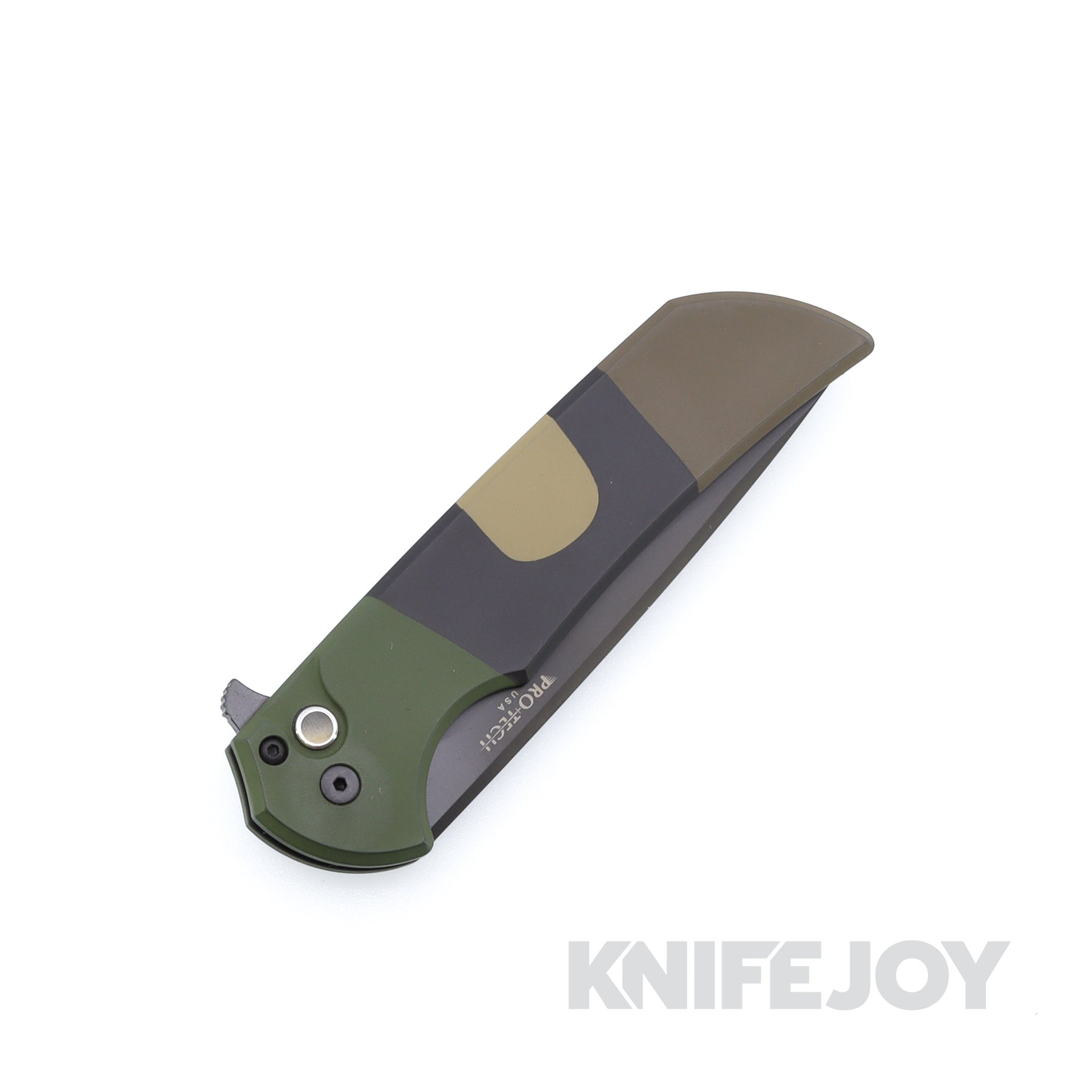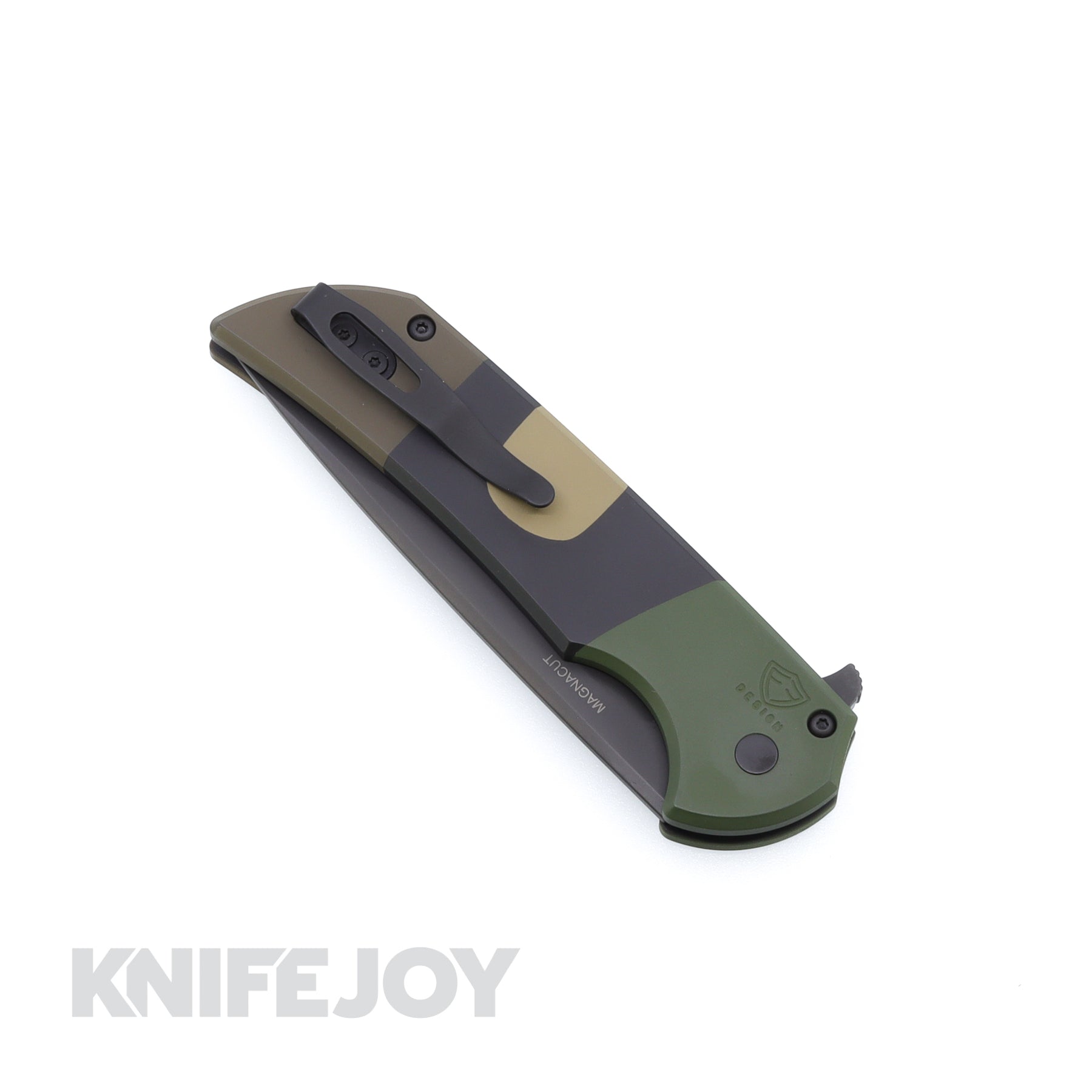 Pro-tech Knives Mordax KnifeJoy Exclusive Black DLC Magnacut Blade with M81 Camo Cerakote Aluminum Handles / Black Lip Mother of Pearl Button / Black Hardware / Black Titanium Clip