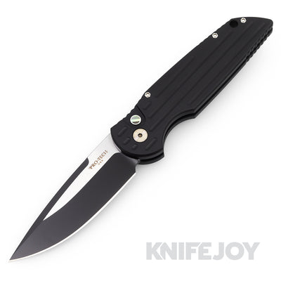 Pro-Tech Knives BSW25.Duke.1 Auto BLADE Show West 2025 Special Duke 2 Stonewash Magnacut Blade with Black Aluminum Handles and Clip / Gold Lip Pearl Button / Satin Hardware
