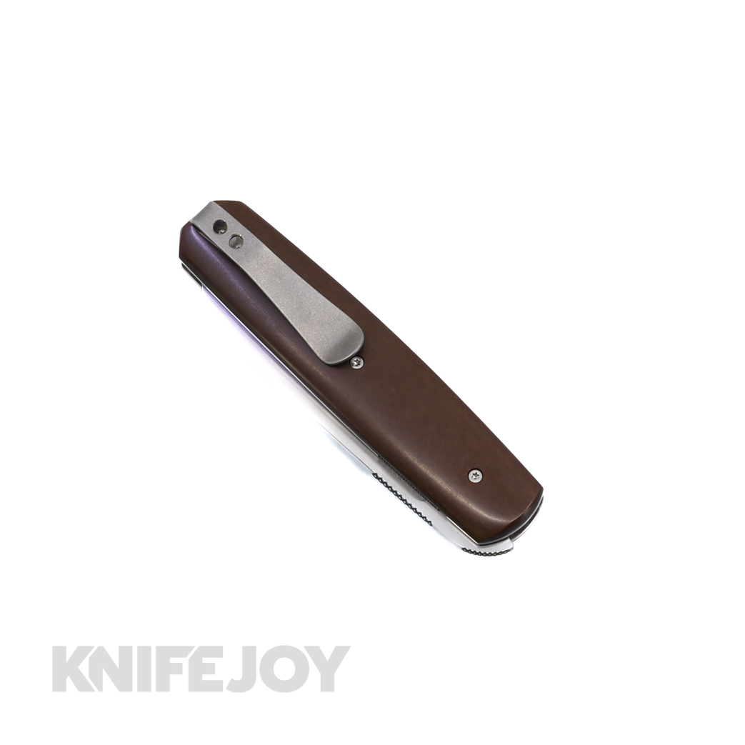 This custom linerlock flipper features a pristine Satin-finished CPM 154 Drop Point blade, known for its excellent balance of edge retention and corrosion resistance. The elegant handle is outfitted with handsome Vintage Brown Paper Micarta scales, which will develop a rich, unique patina over time. Contrasting Titanium bolsters provide a touch of modern class and structural integrity.