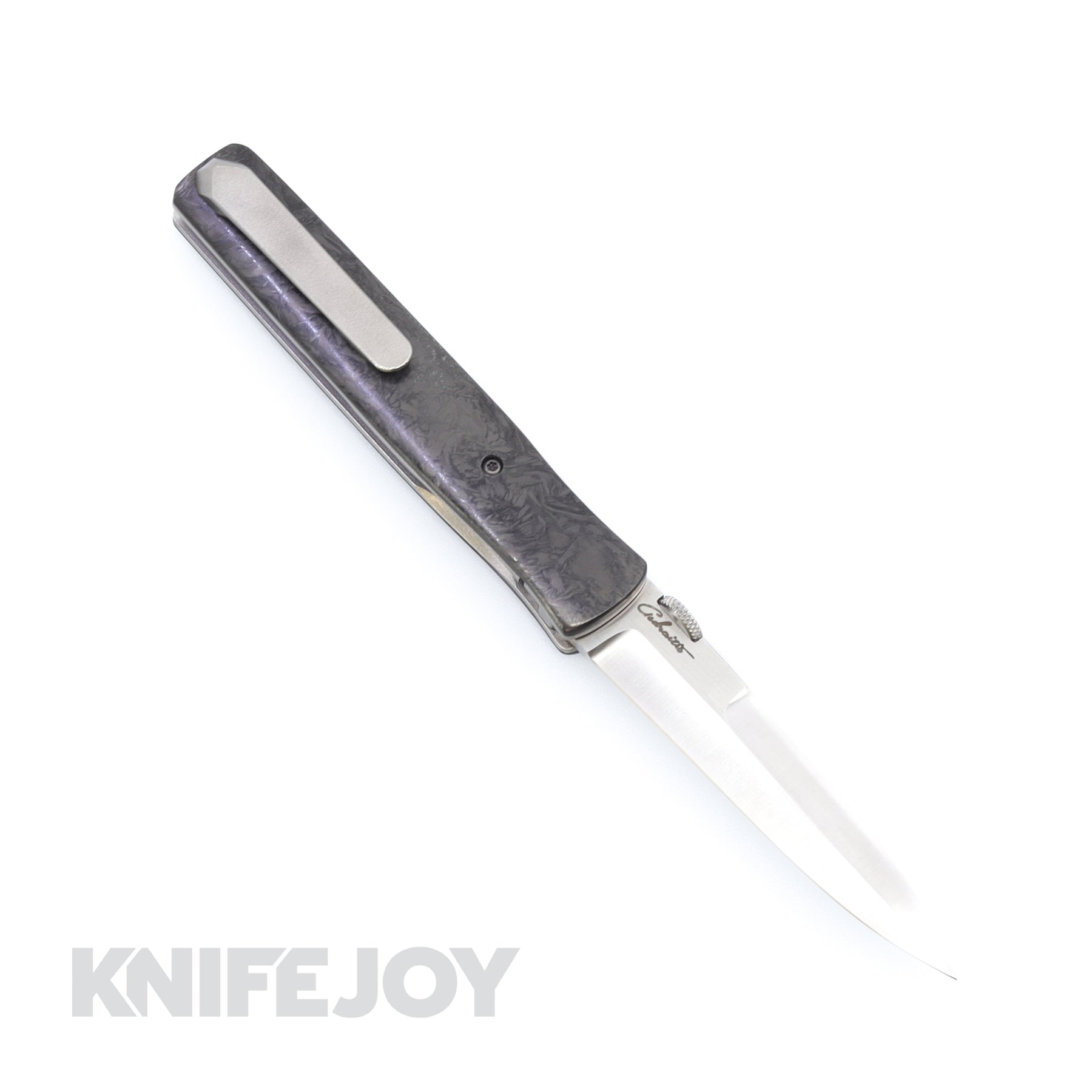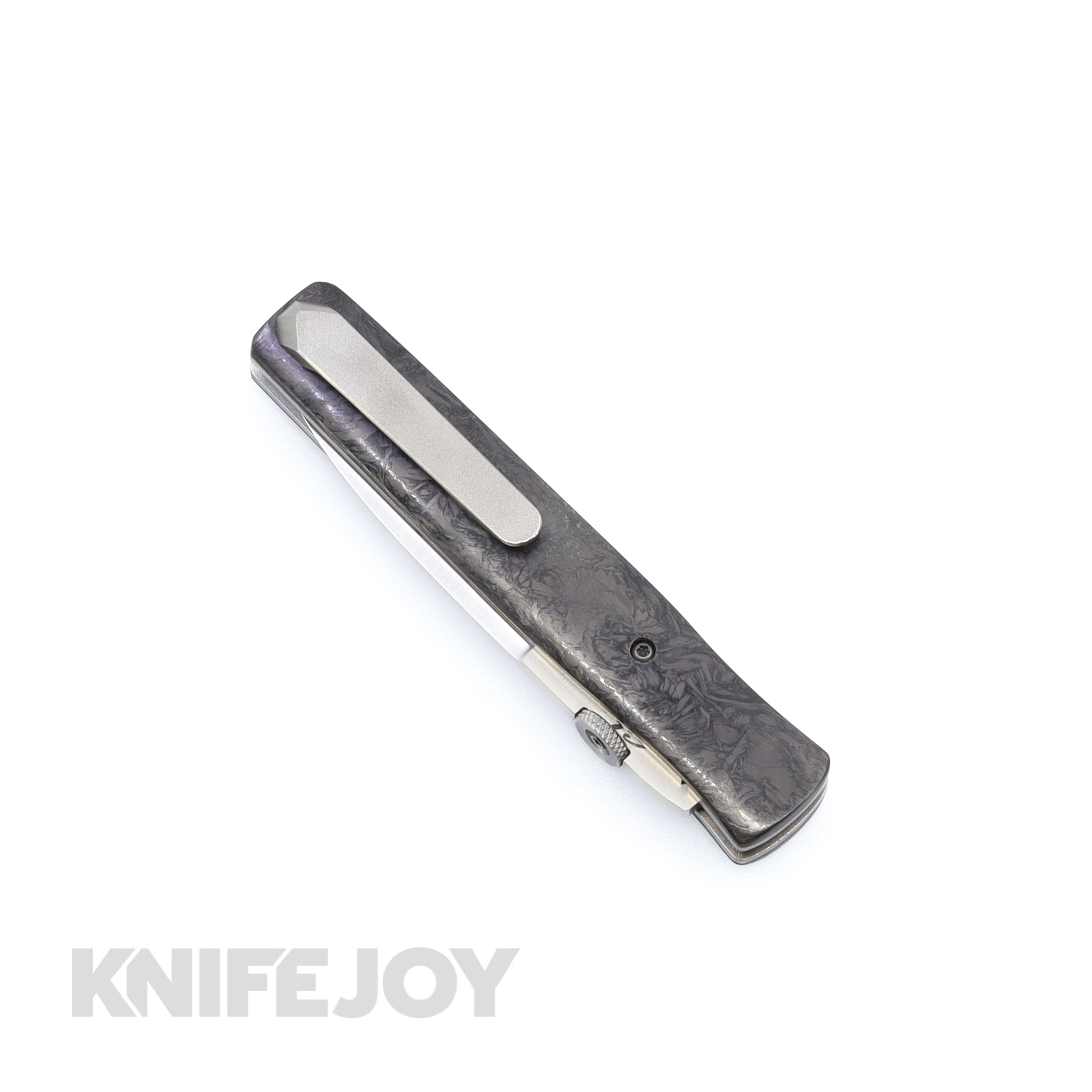 This handmade folding dagger features a NITRO-V blade with a thumb-disk opener. The machined clip and liner lock are titanium, while the scales are UV-reactive marbled carbon fiber that glow. It is an excellent example of Mr. Gedraitis’s craftsmanship and attention to detail.