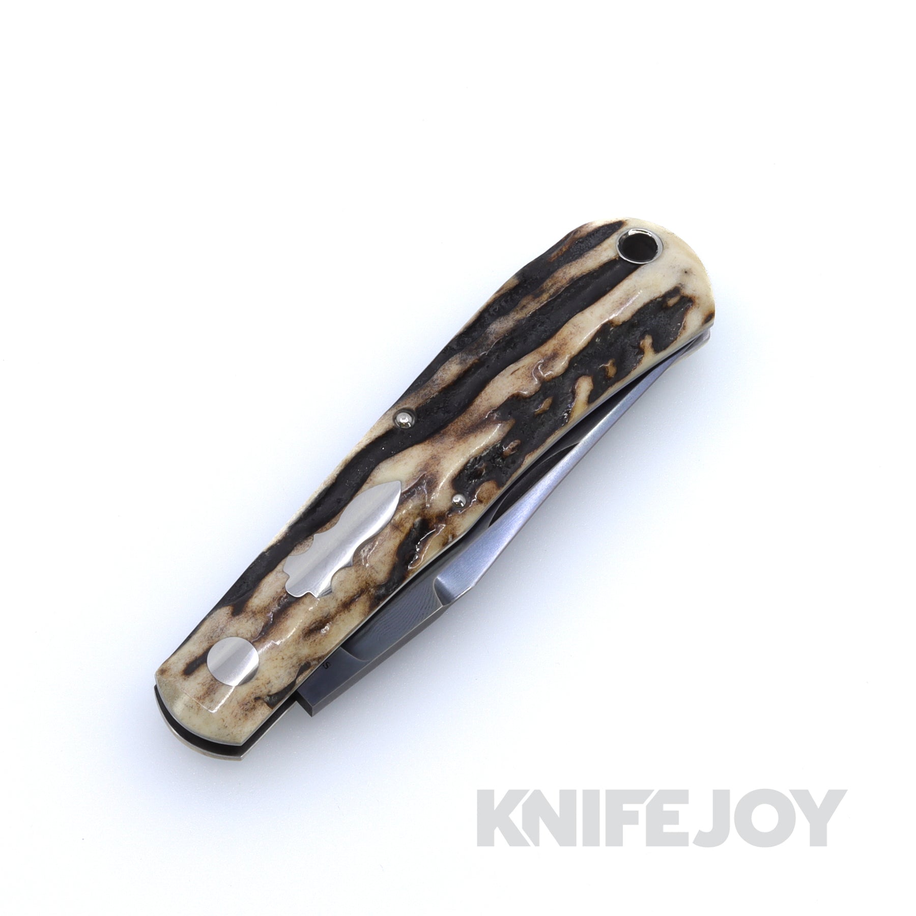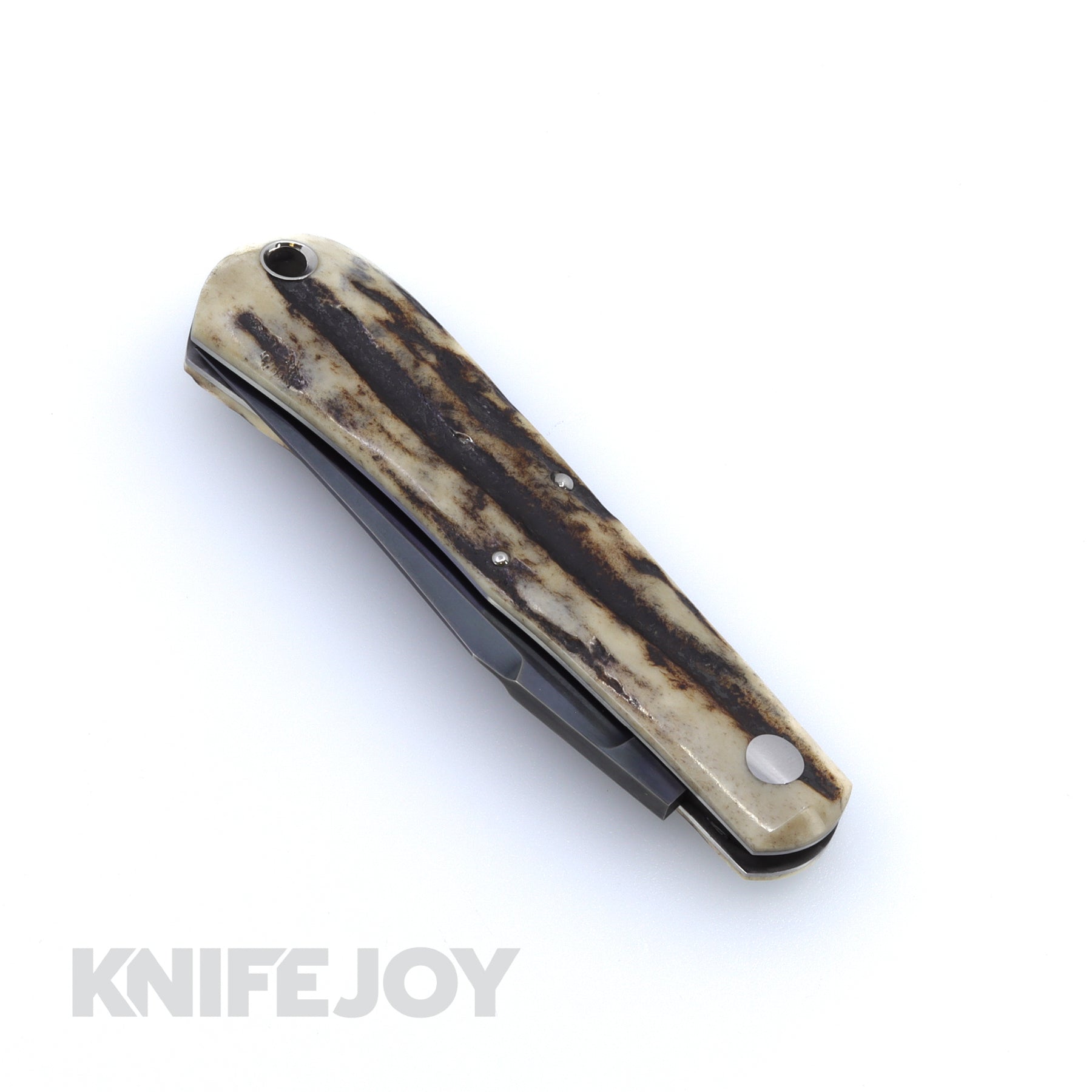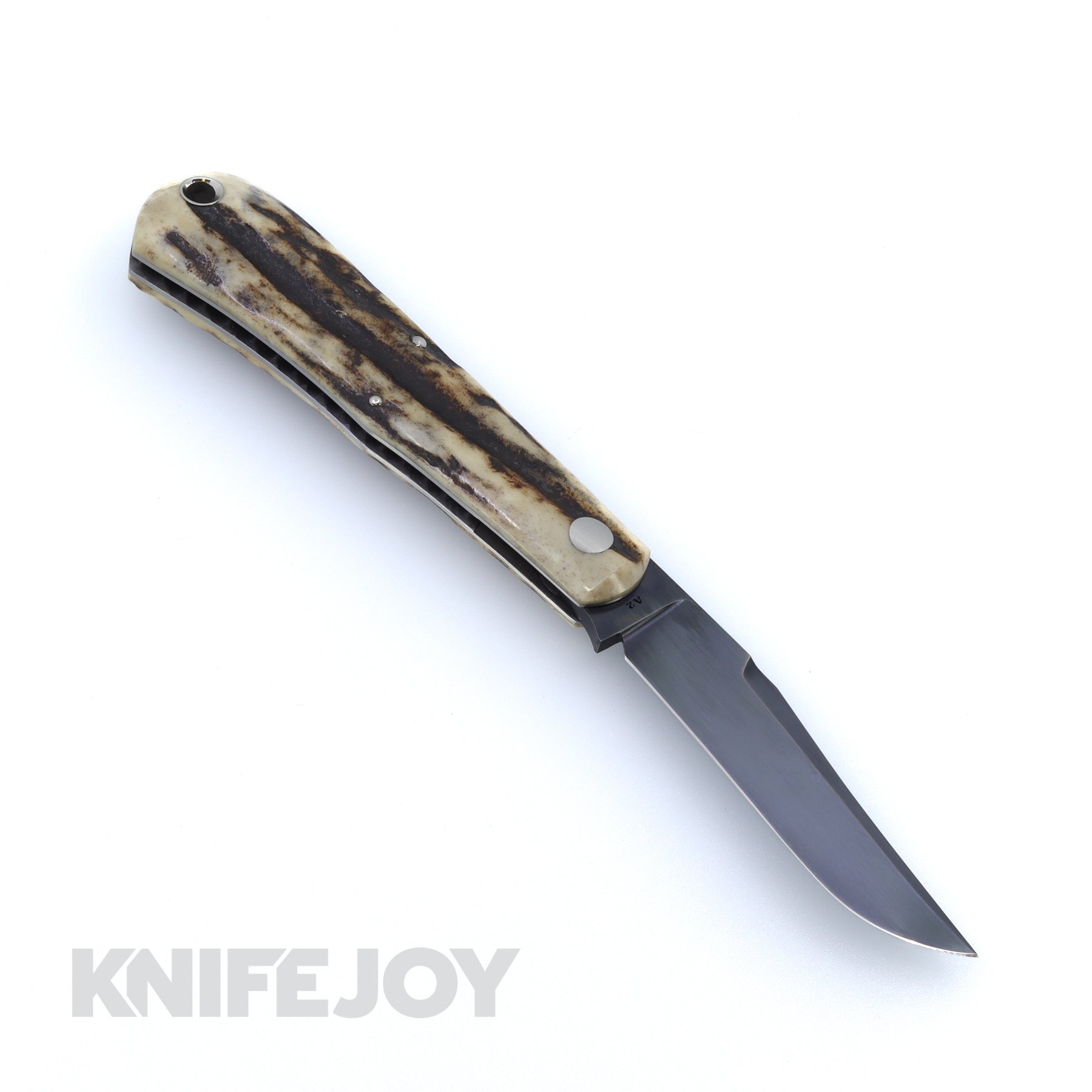 This handcrafted Back Pocket Trapper by Grayson Jennings blends traditional style with modern, custom craftsmanship. It features a finely ground A2 tool steel blade, heat-treated to 62 HRC, in a classic trapper profile. The hand-selected Sambar stag handle scales are beautifully contoured for both grip and character, accented with a distinctive double bomb shield for a refined finishing touch.