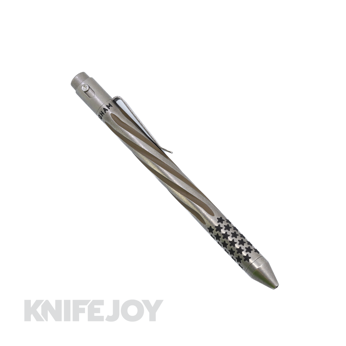 This is our newest design in our award winning {patent pending} ballpoint ink pen line. All of our pens are completely machined and built in house, including the mechanism. The TiButton was created and mastered over a two year period. In that time, we manufactured four variations of the TiButton mechanism; Right or Left Handed and Single or Double Locking, allowing you to choose the pen that is perfect for you!