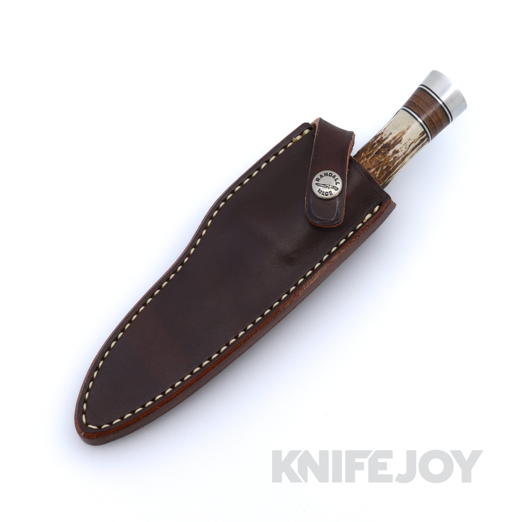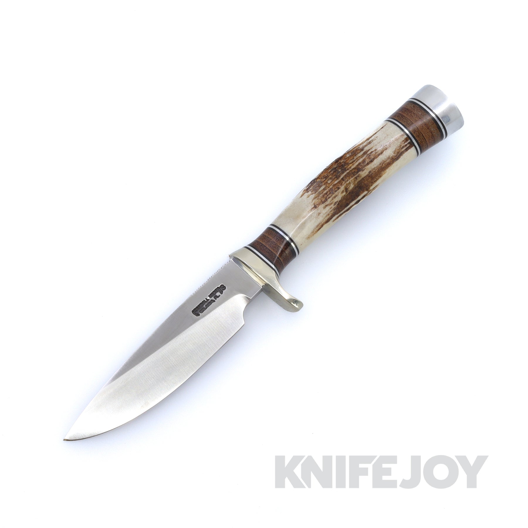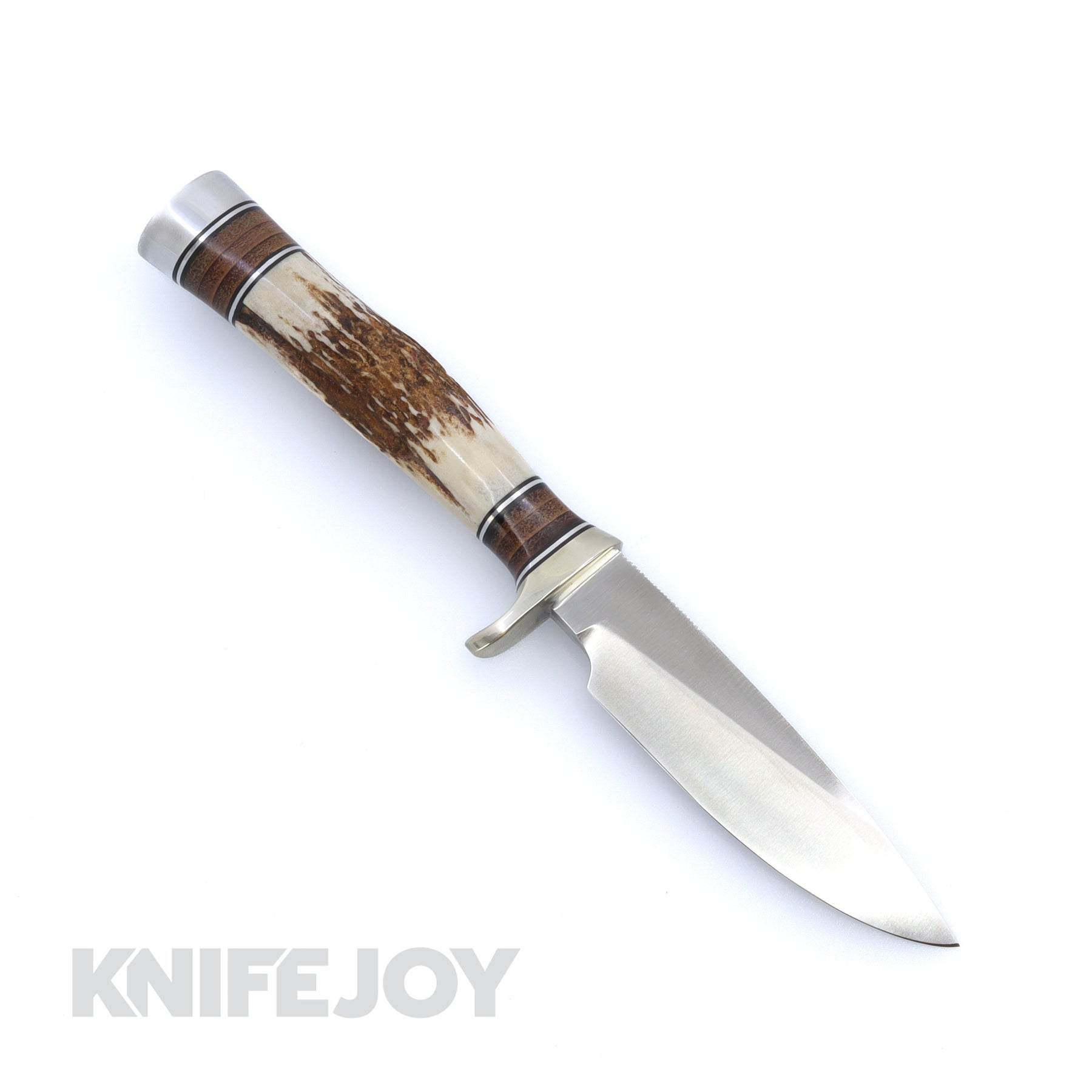Excellent skinning and outdoors knife with drop point blade. Special feqatures include a Beautiful Stag handle with Leather spacers, Duralumin butt cap, Nickel Single Guard with top thumb notches on a Stainless Steel blade. Model D Cover sheath supplied. If you are looking for a great knife for any hunting trip this is one of the best!
