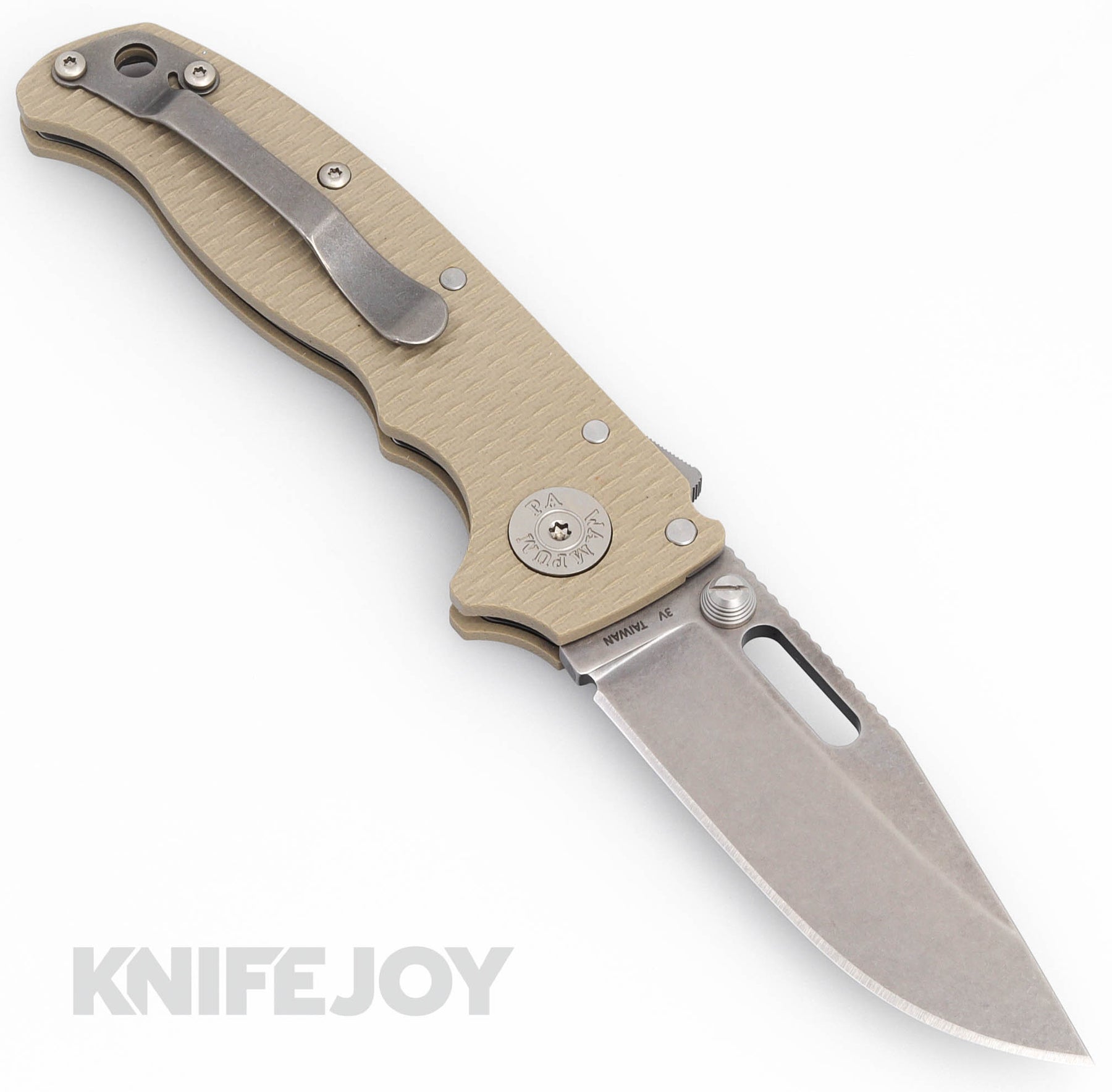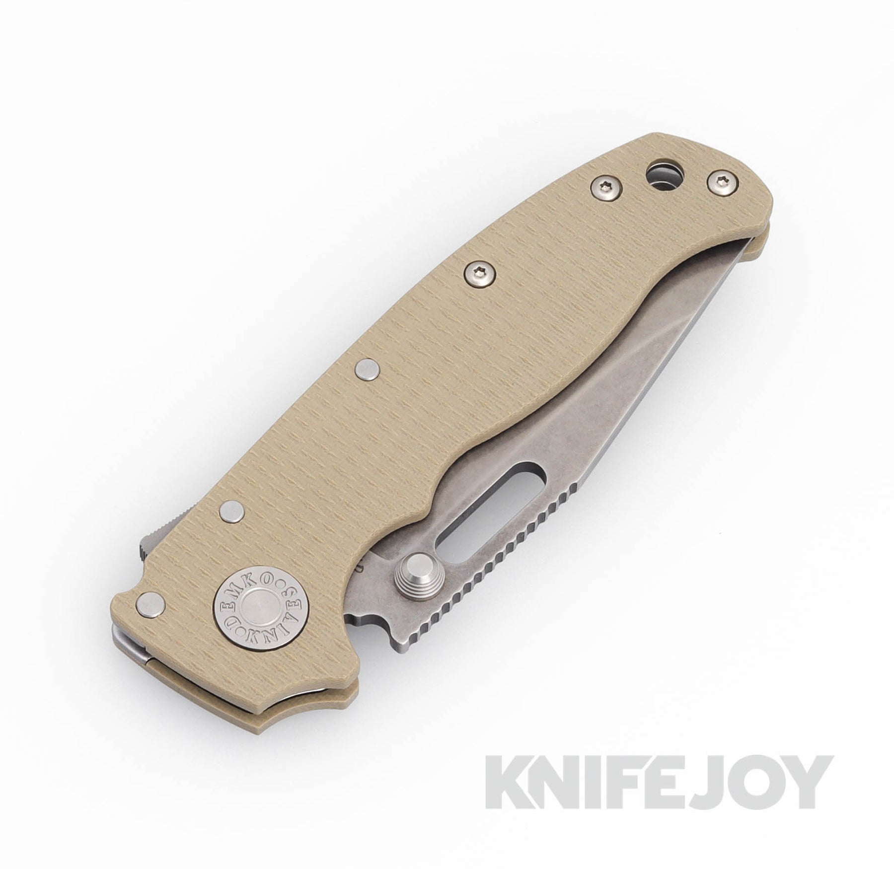 The AD20.5 by Demko Knives features the all-new Shark-Lock™. The Shark Lock mechanism is situated on the spine of the knife and operated with a ramp-like ‘fin.’ Available in two different blade shapes, this knife features ball bearings on the pivot pin, steel liners, Coyote Tan G10, and a left-handed pocket clip included.