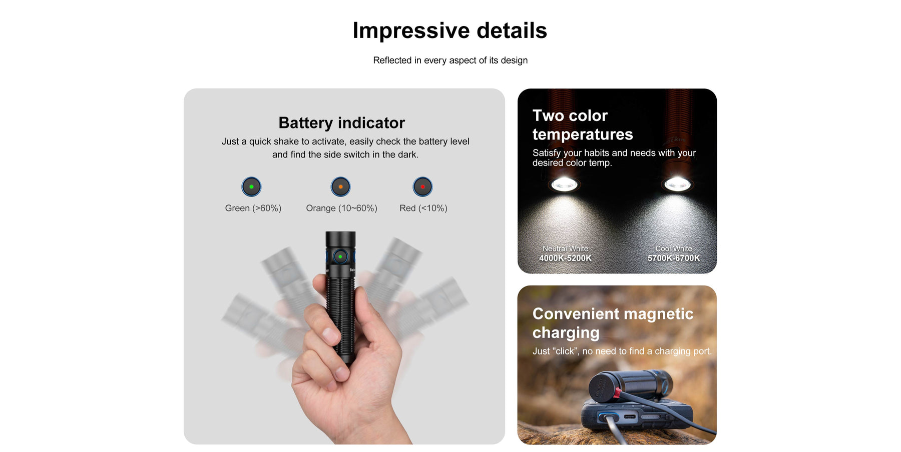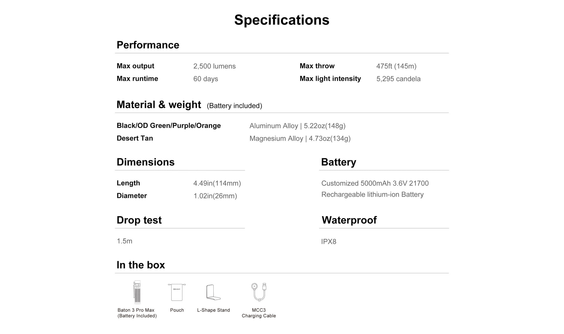 The Baton 3 Pro Max is a compact and powerful EDC flashlight with a customized 5000mAh 21700 rechargeable lithium-ion battery. It features a high performance LED, proximity sensor, magnetic charging, larger side switch, etc. Rated IPX8 waterproof and 1.5 meter drop resistance, it can handle hard drops and occasional water immersion. It is applicable for camping, hiking, night work, emergency power outage, etc.