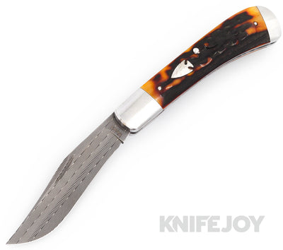 Crouch Knives Custom Single Blade Trapper Vegas Forge Carbon Herring Bone Damascus Blade with Amber Stag Handles