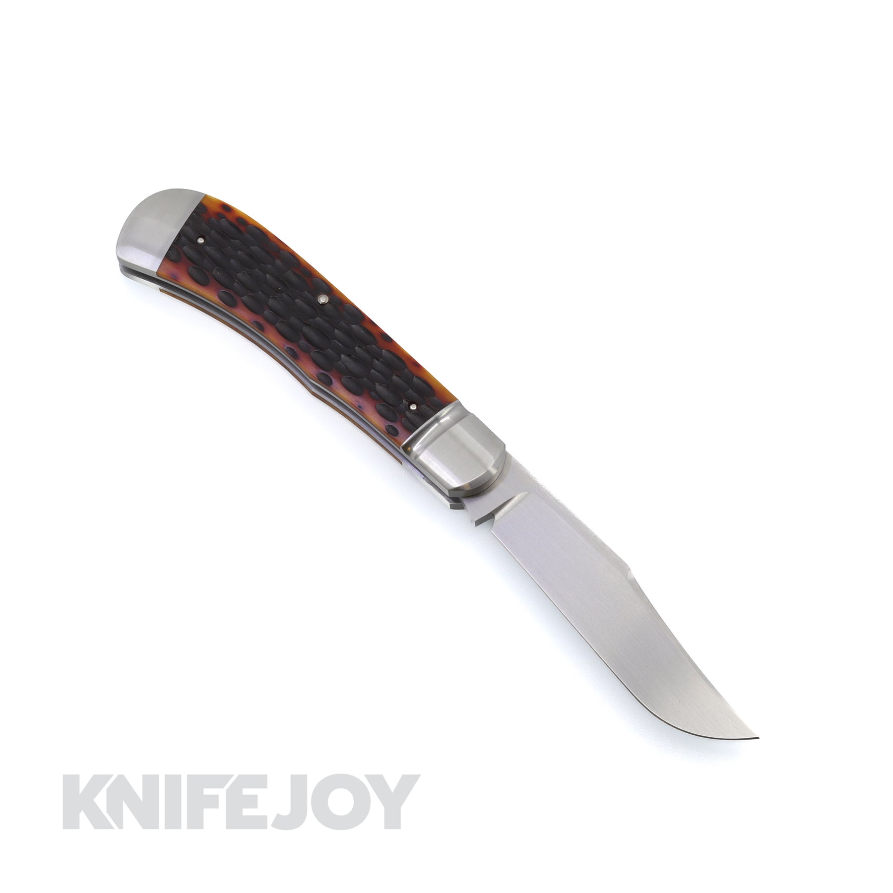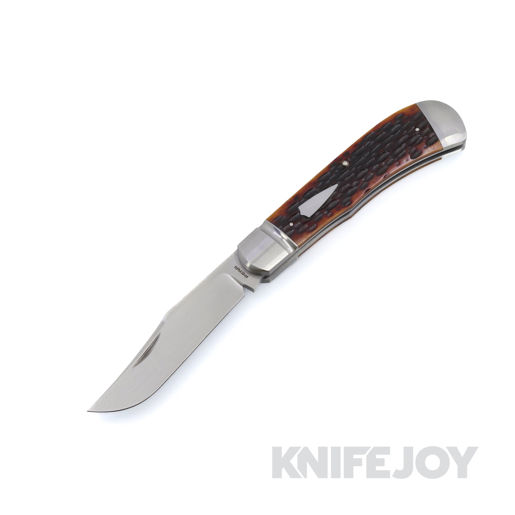 This custom Pena XL South Texas Trapper is made from amber jigged bone on the scales, and the blade material is CPM154 steel. This is a one-of-a-kind slipjoint.