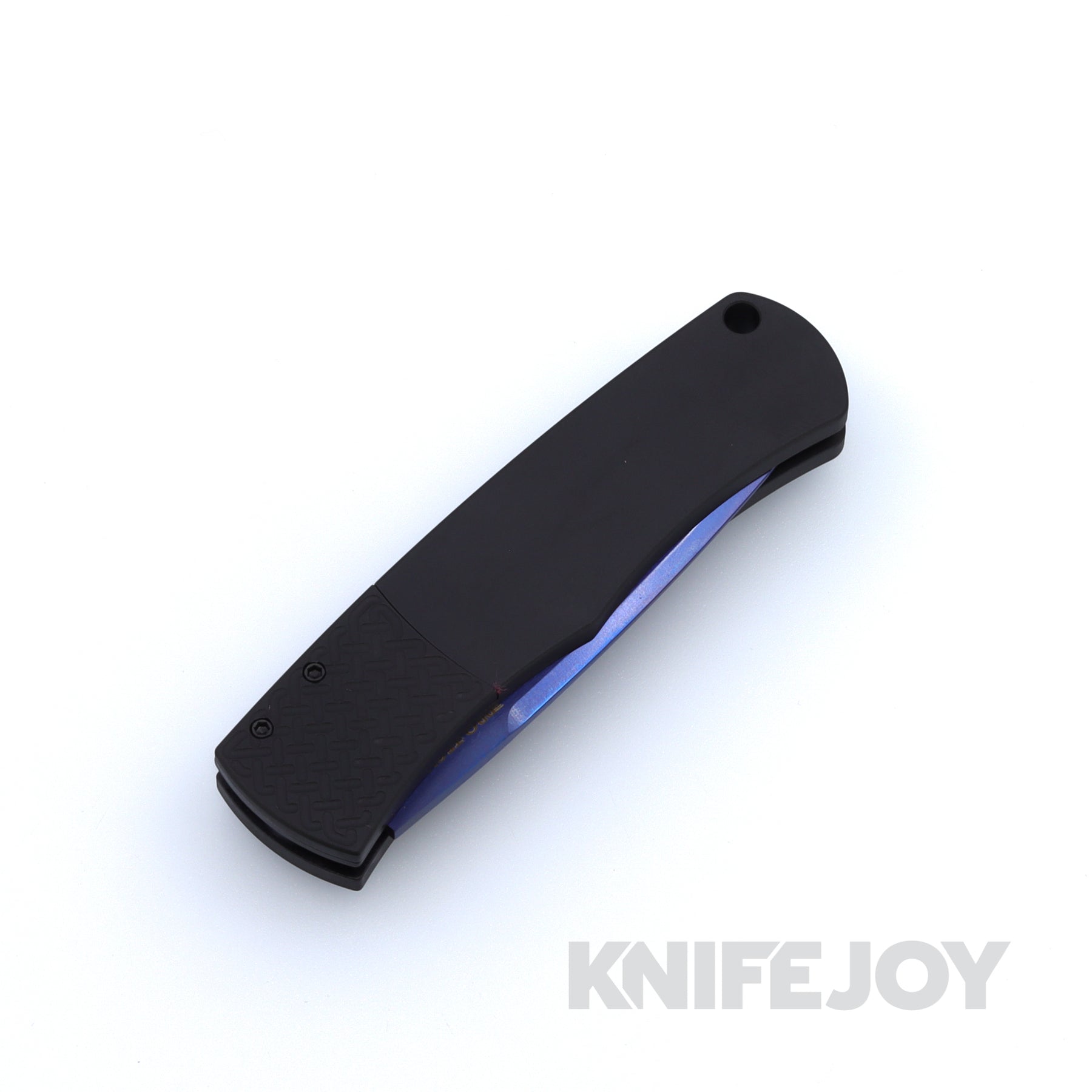 Black handle with patterned black bolster, Sapphire Blue Blade – PLAIN Edge
