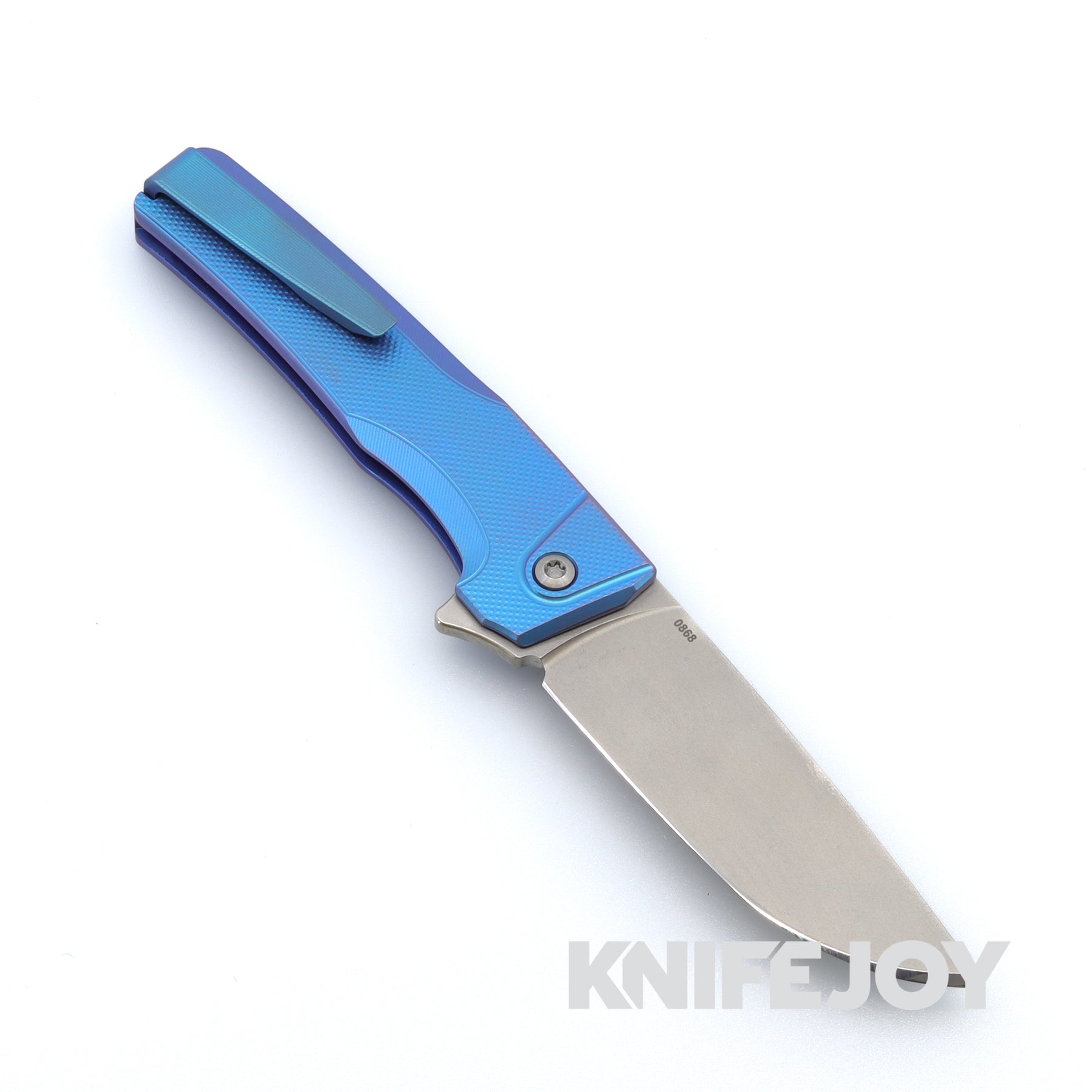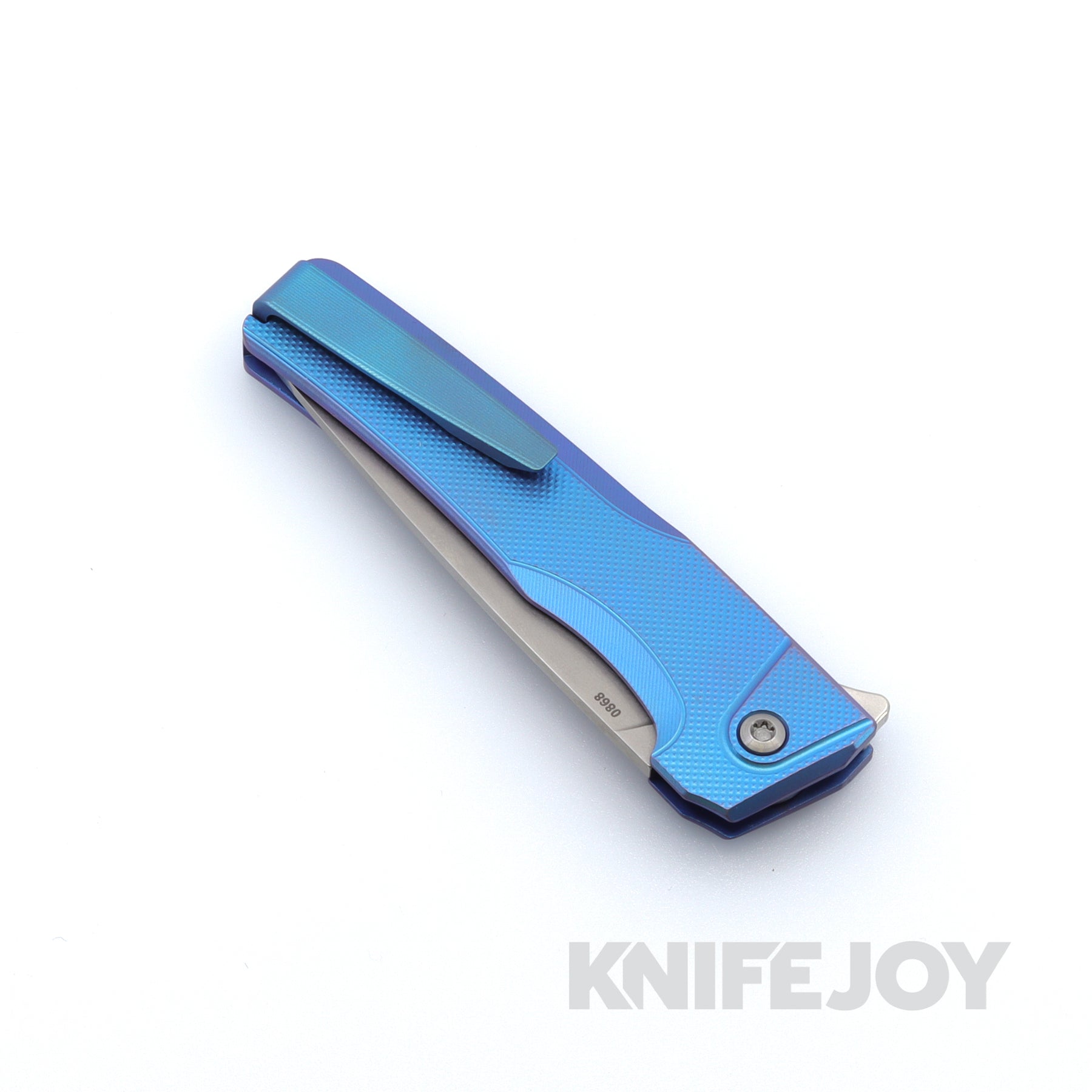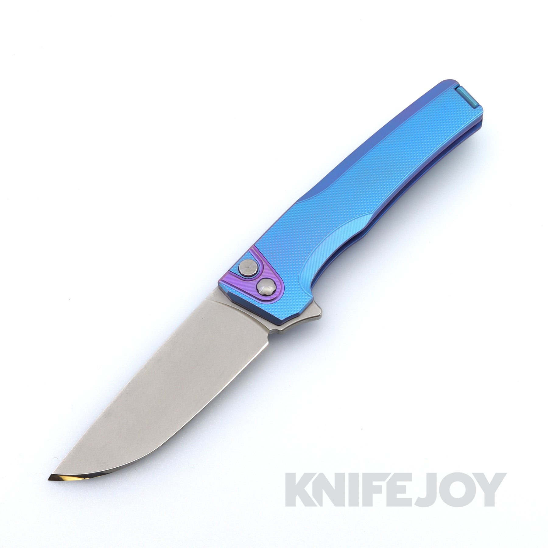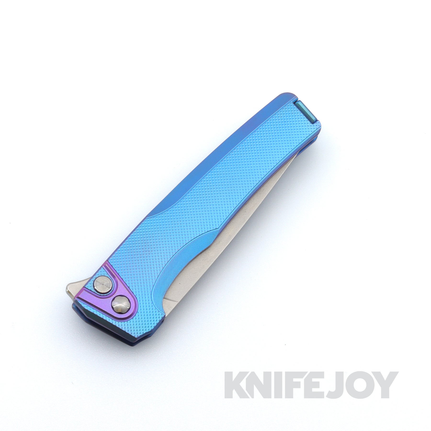MachineWise Sonora Button Lock Folder Lightwash Blade with DIamond Textured Grade 5 Electric Blue Titanium Handles and Clip / Purple Titanium Bolster