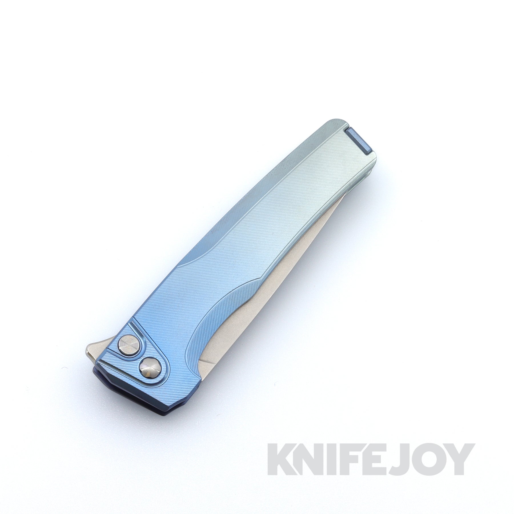 MachineWise Sonora Button Lock Folder Lightwash Blade with Fine Step Textured Grade 5 Ice Blue Fade Titanium Handles / Blue Titanium Bolster and Clip