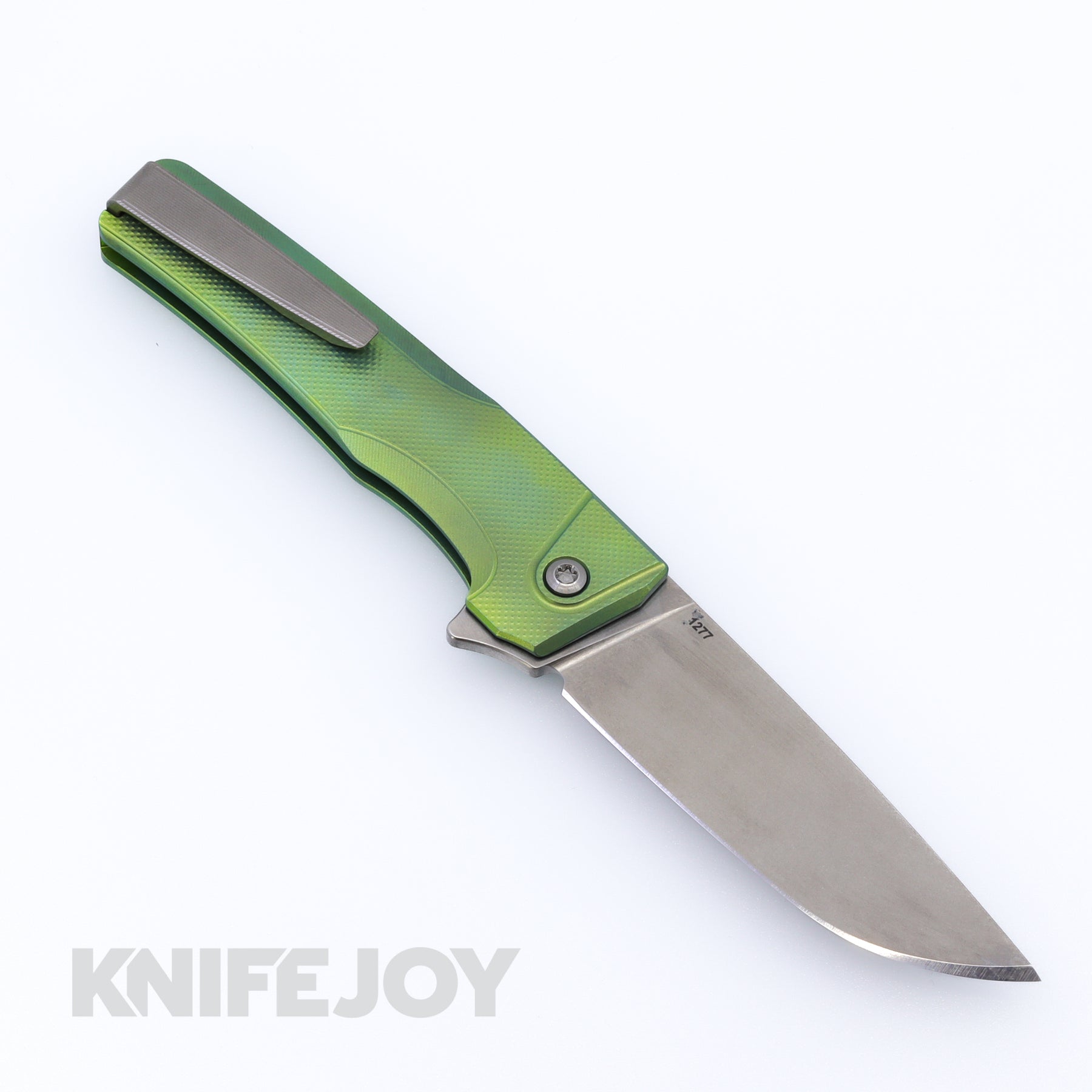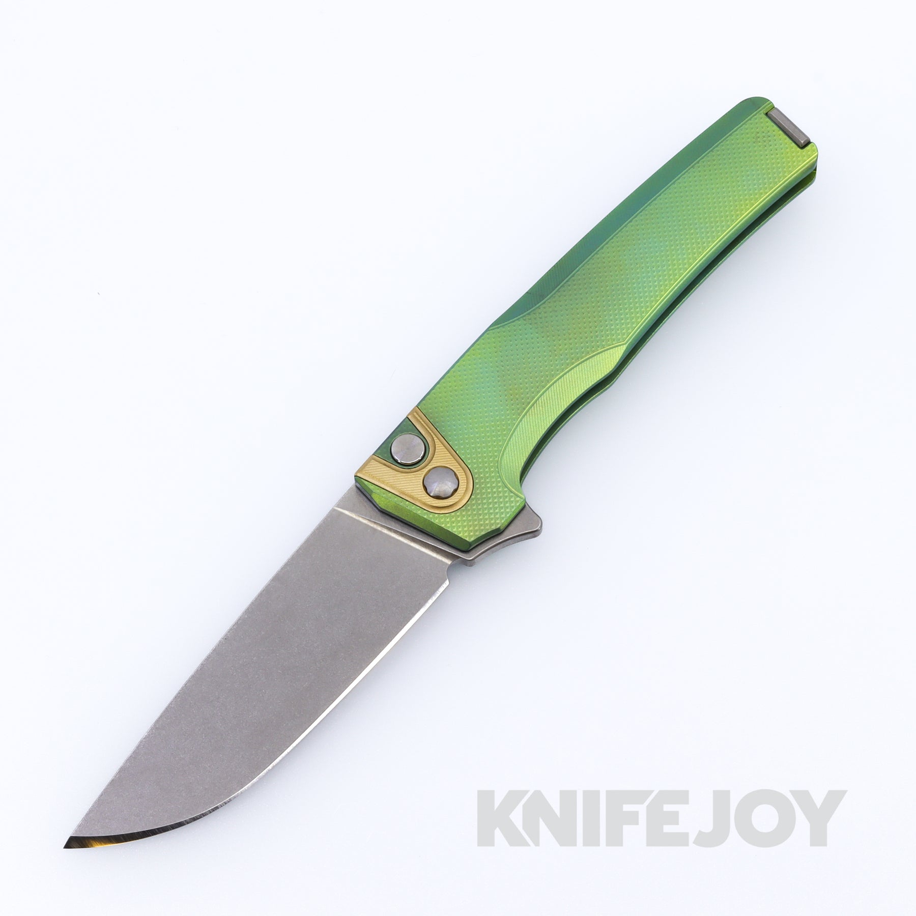MachineWise Sonora Button Lock Folder Stonewash Blade with Diamond Textured Grade 5 Green Titanium Handles / Brass Titanium Bolster and Raw Titanium Clip