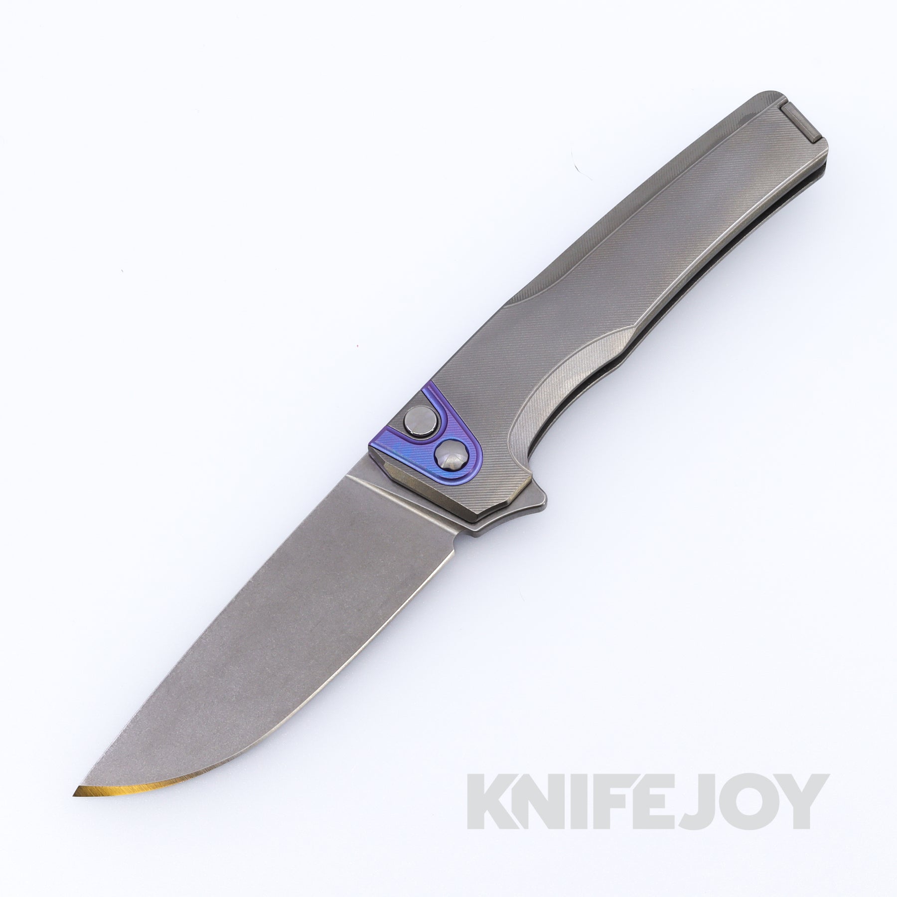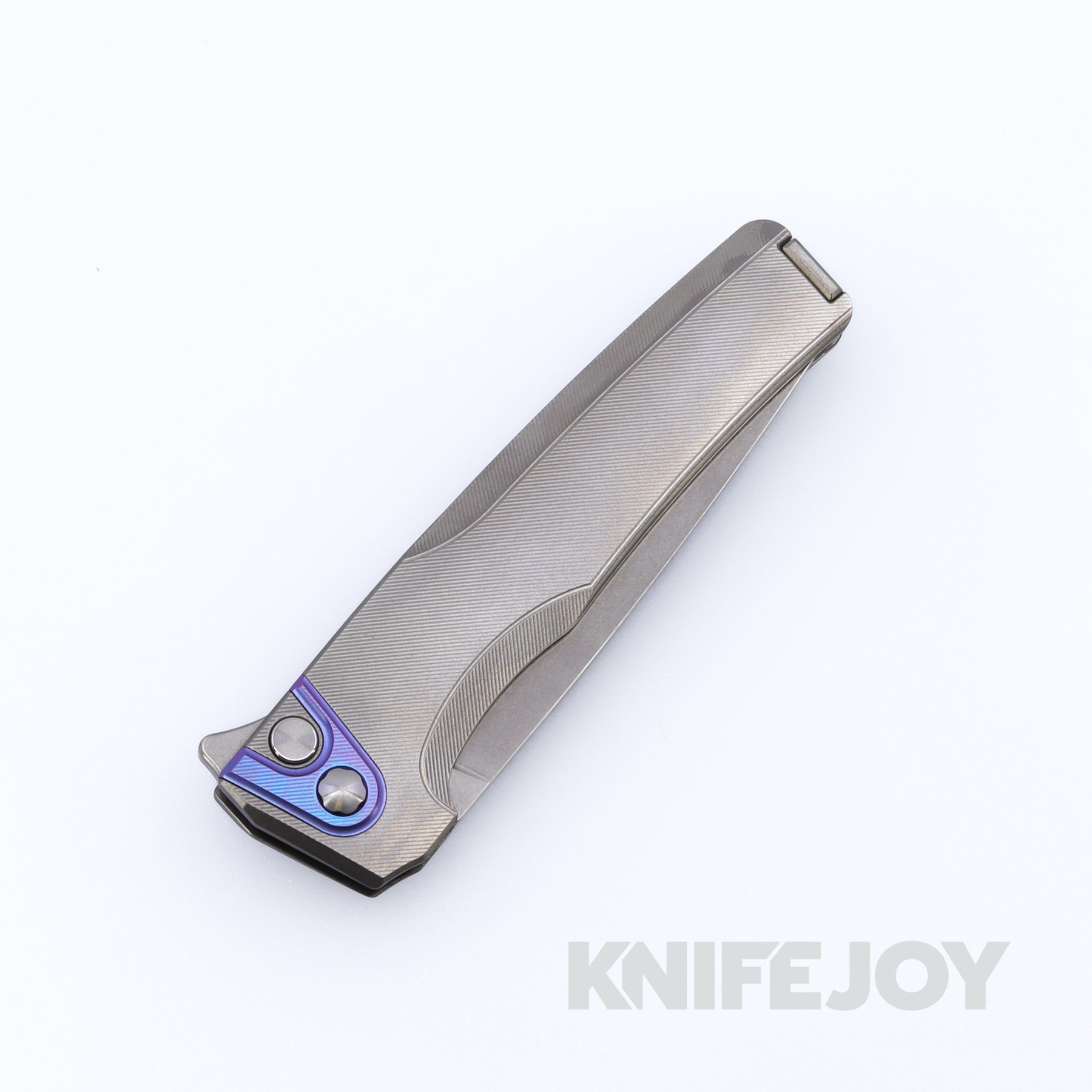 MachineWise Sonora Button Lock Folder Stonewash Blade with Fine Step Textured Grade 5 Raw Titanium Handles / Blurple Titanium Bolster and Raw Titanium Clip
