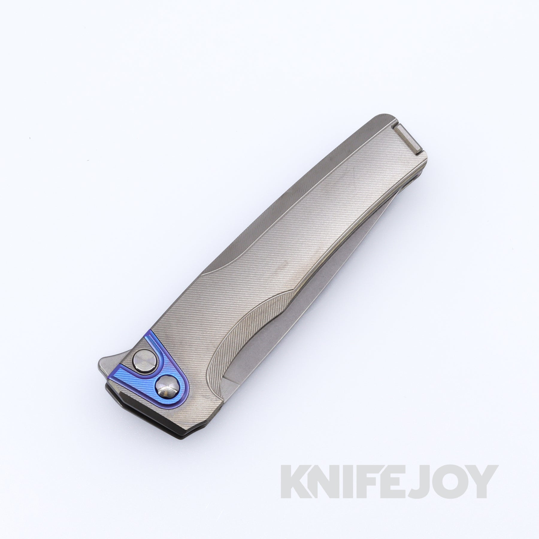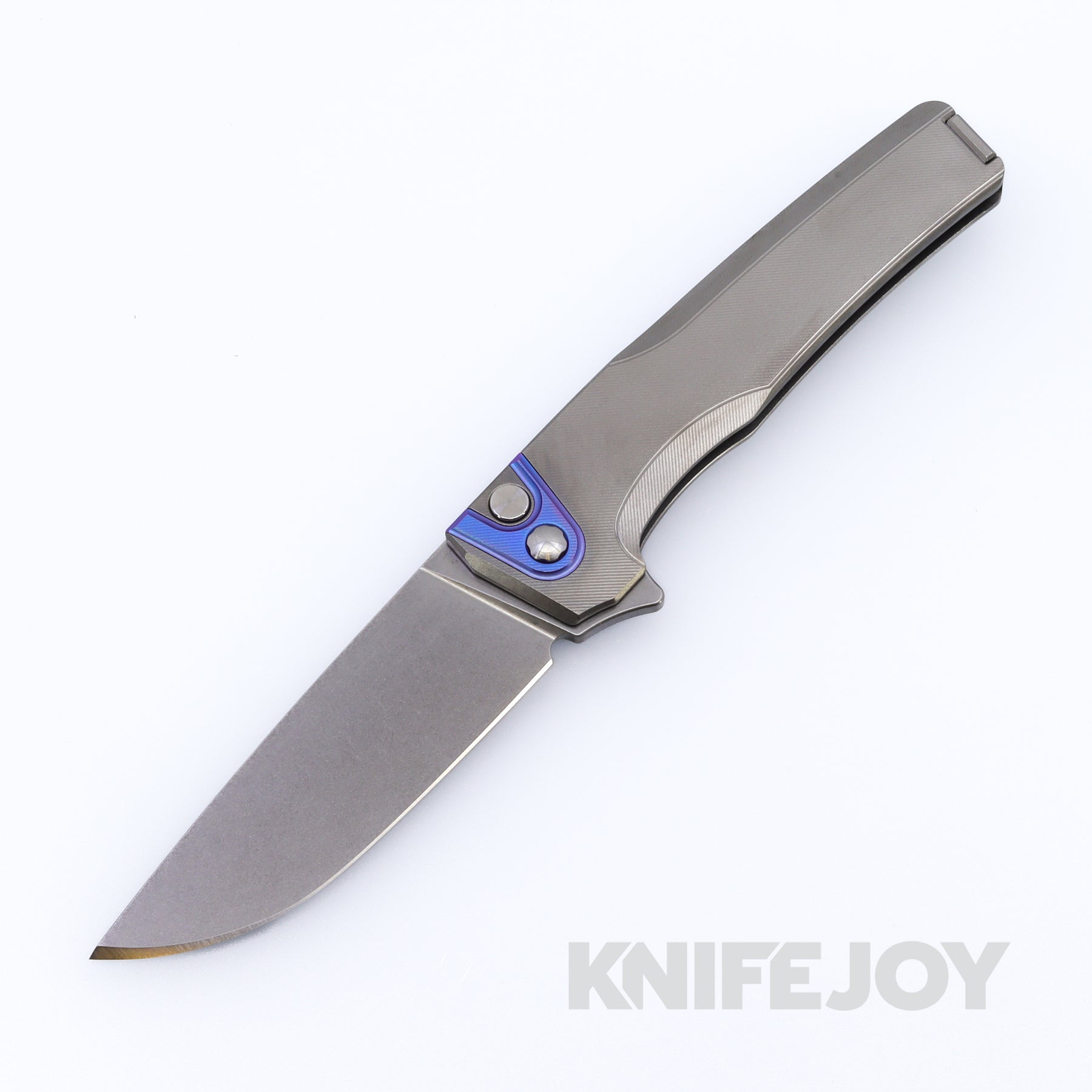 MachineWise Sonora Button Lock Folder Stonewash Blade with Fine Step Textured Grade 5 Raw Titanium Handles / Blurple Titanium Bolster and Raw Titanium Clip