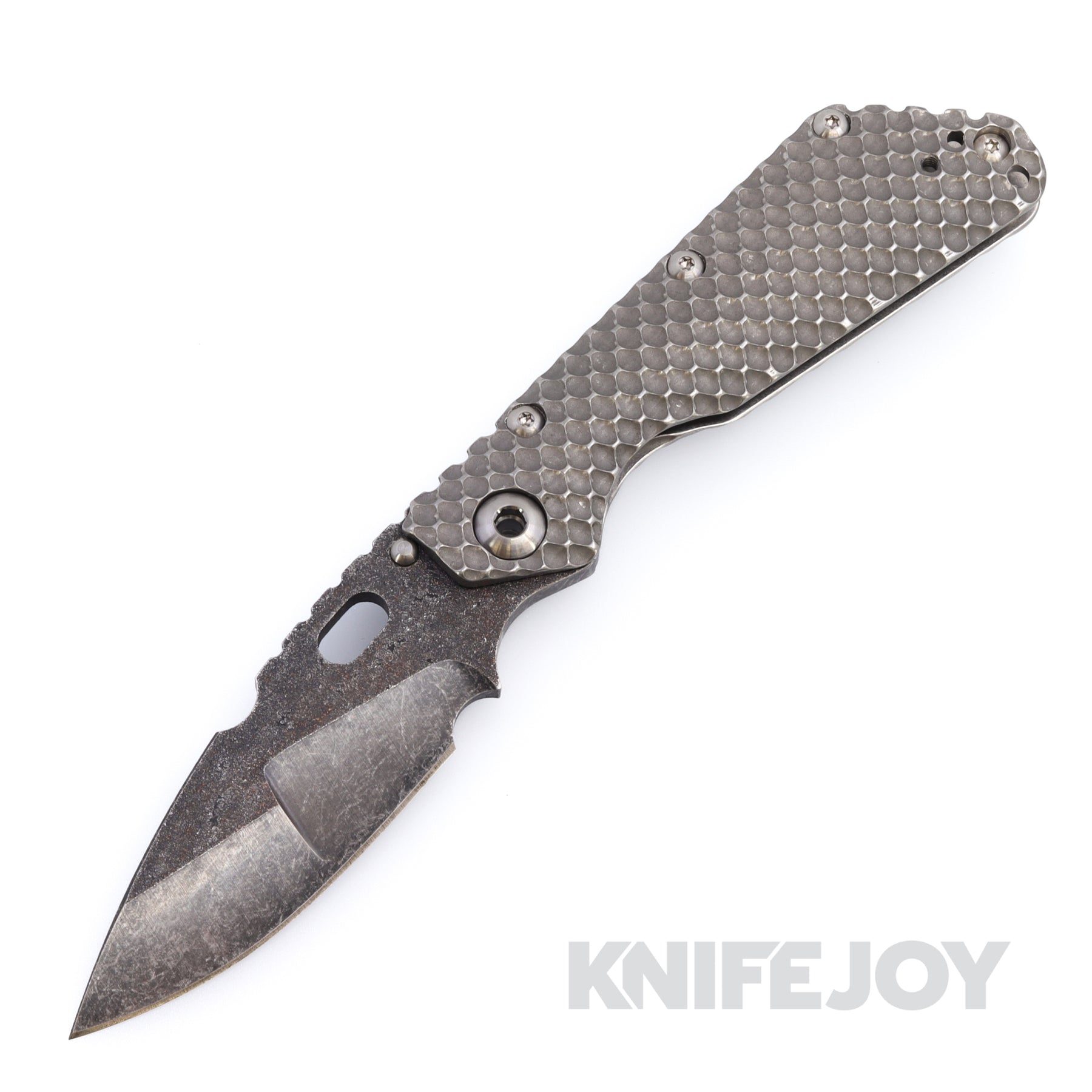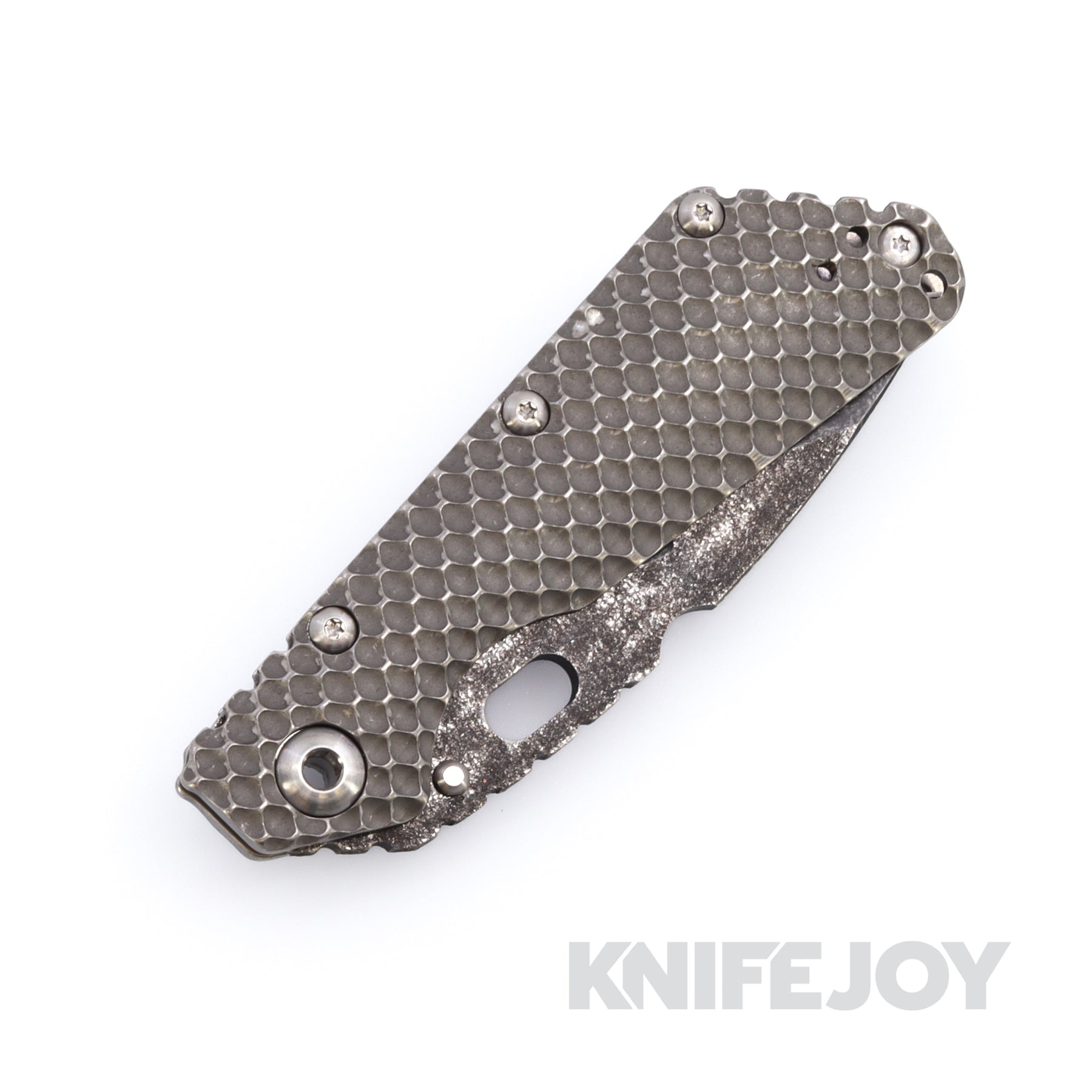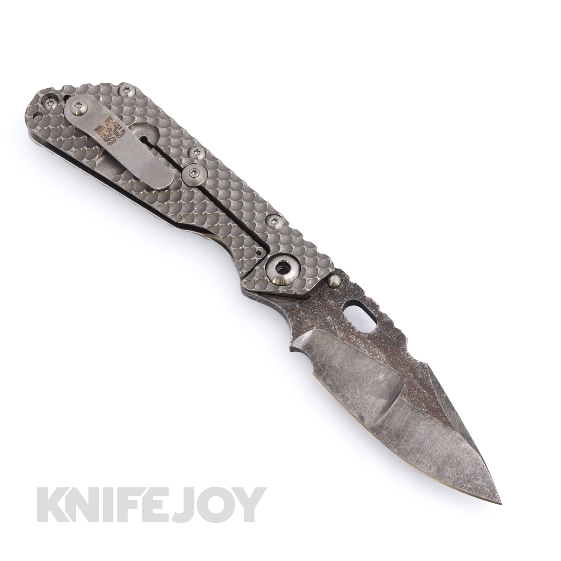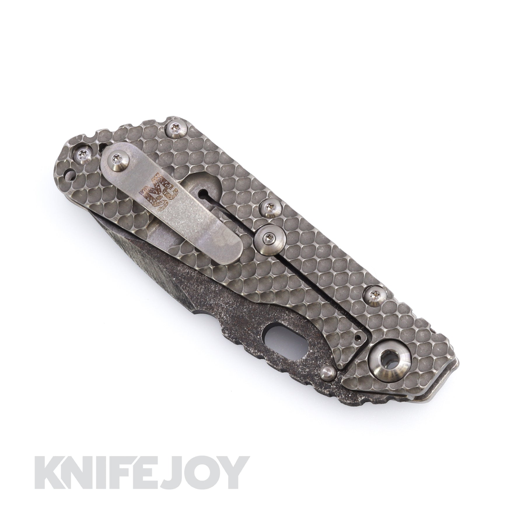 Mick Strider Customs SMF. Double Titanium Gunner Grip handle with A Mick Hand-ground Nightmare Grind Dark Acid Wash Magnacut blade. The blade also features a top swedge Trisula Grind.  A Performance Pivot and Ambi Clip Option are also featured.