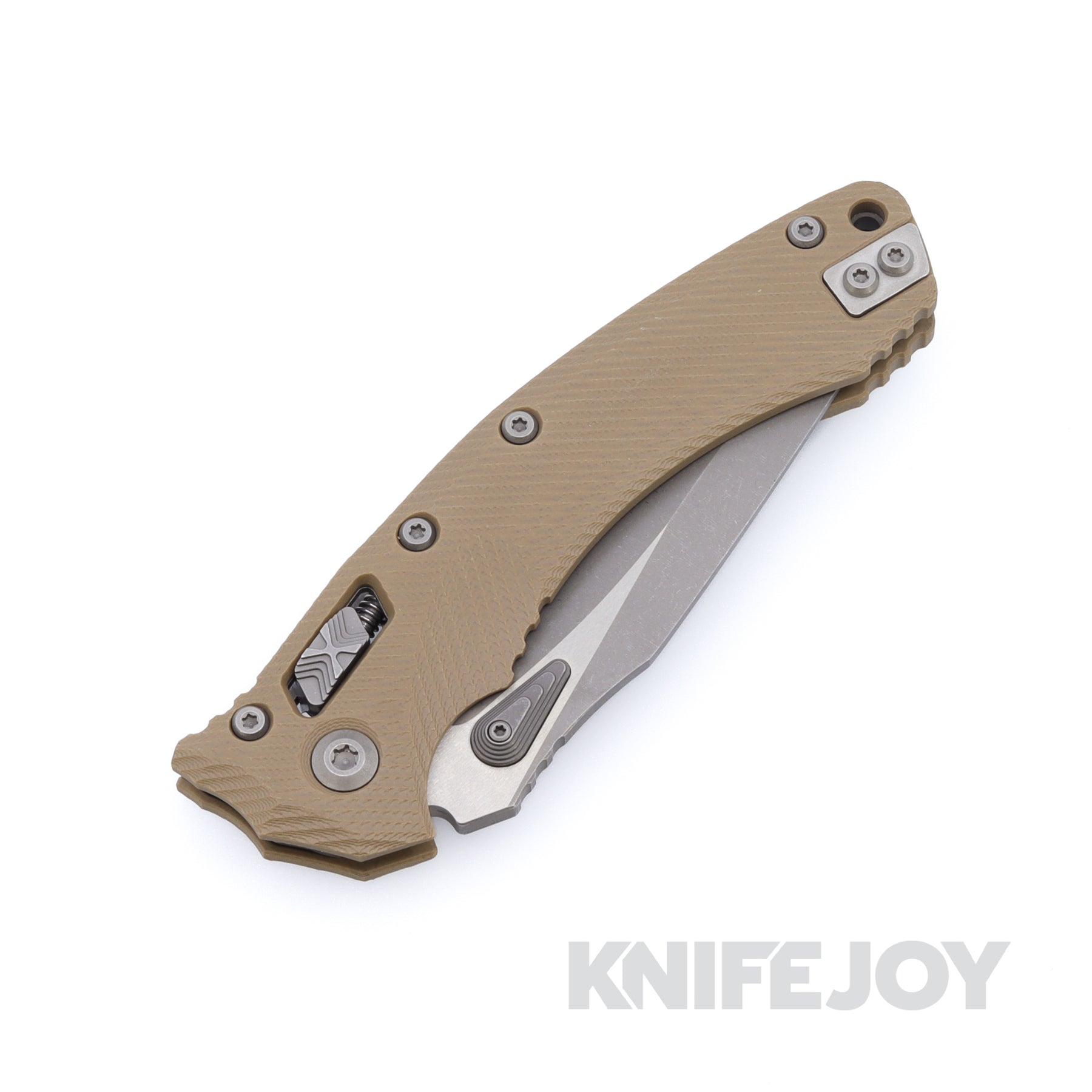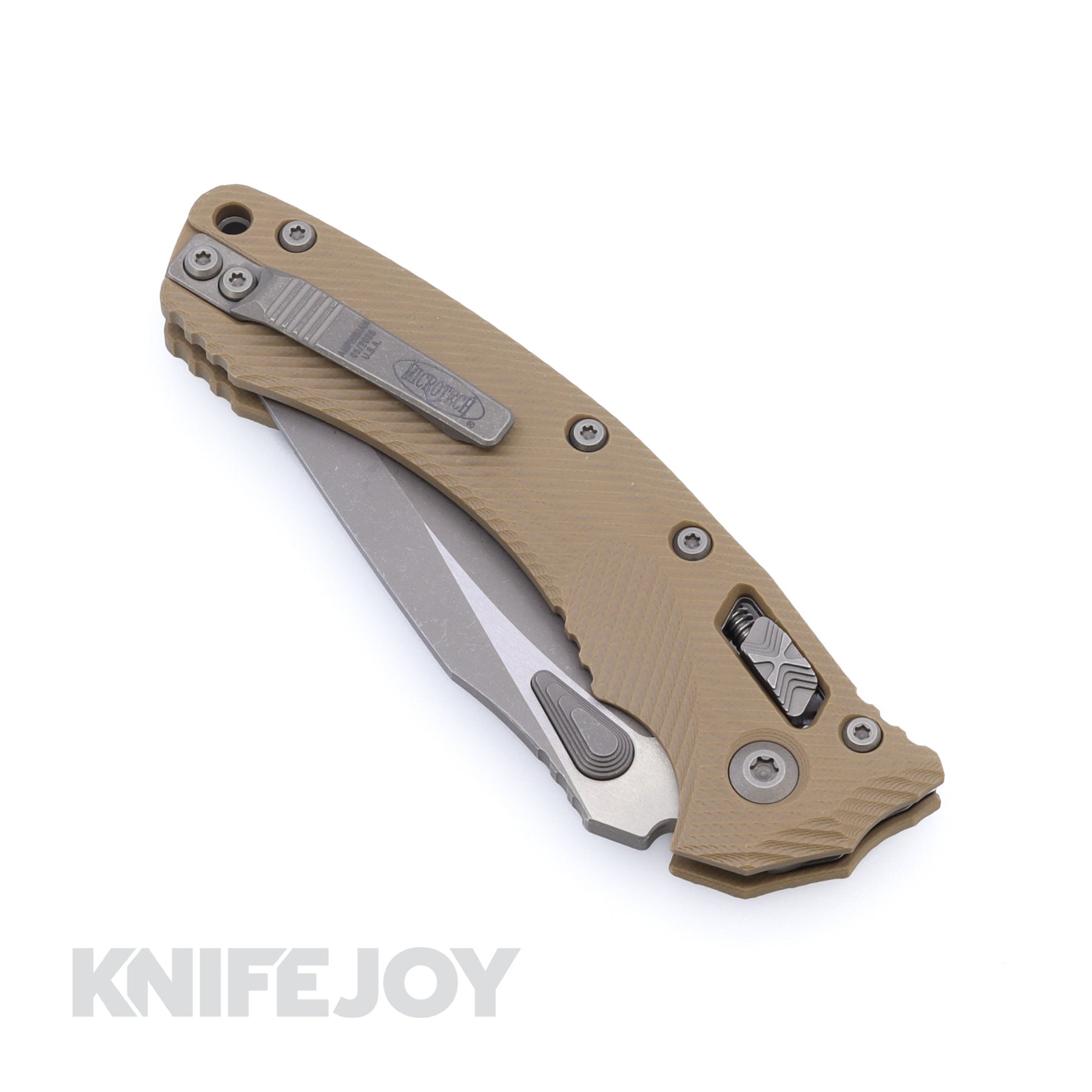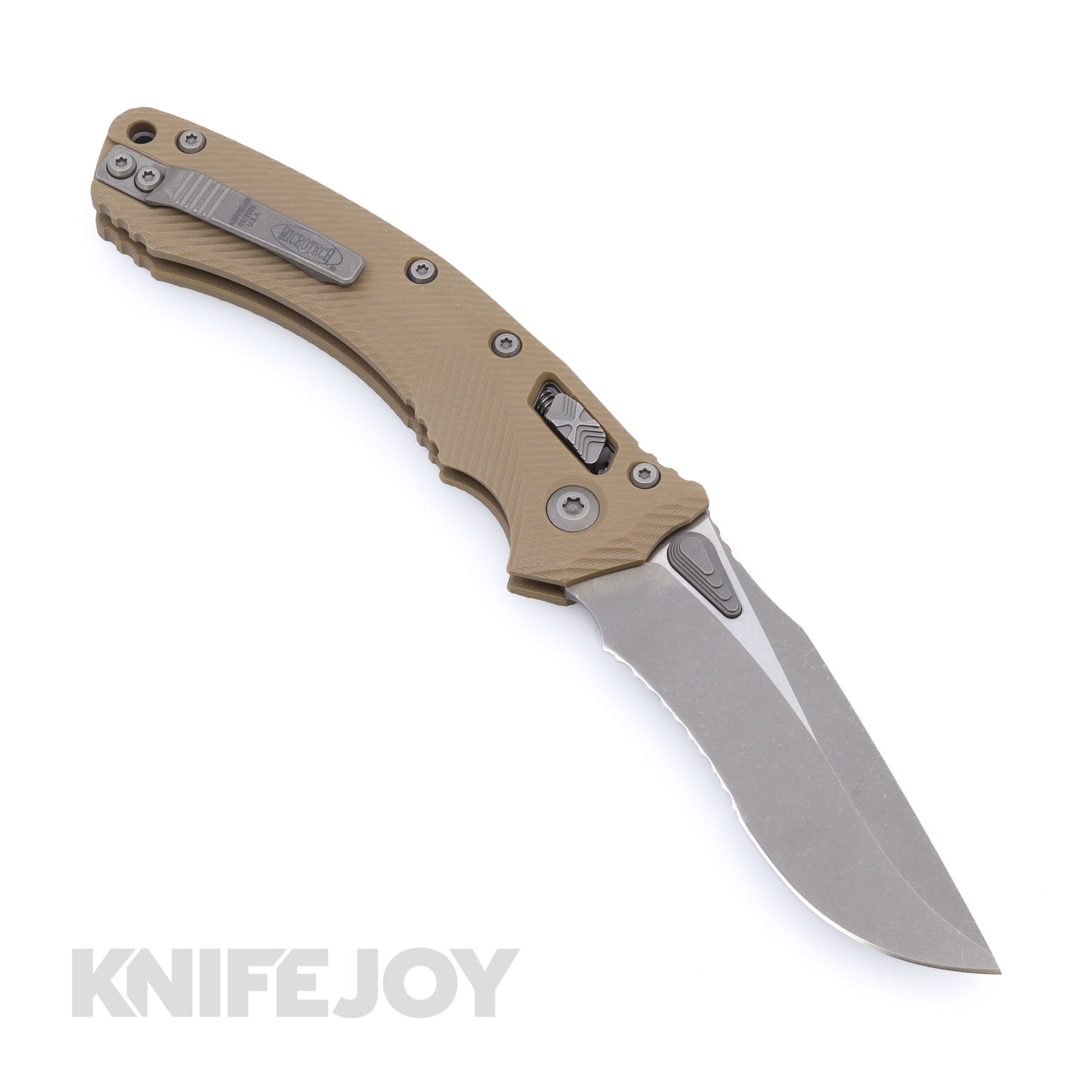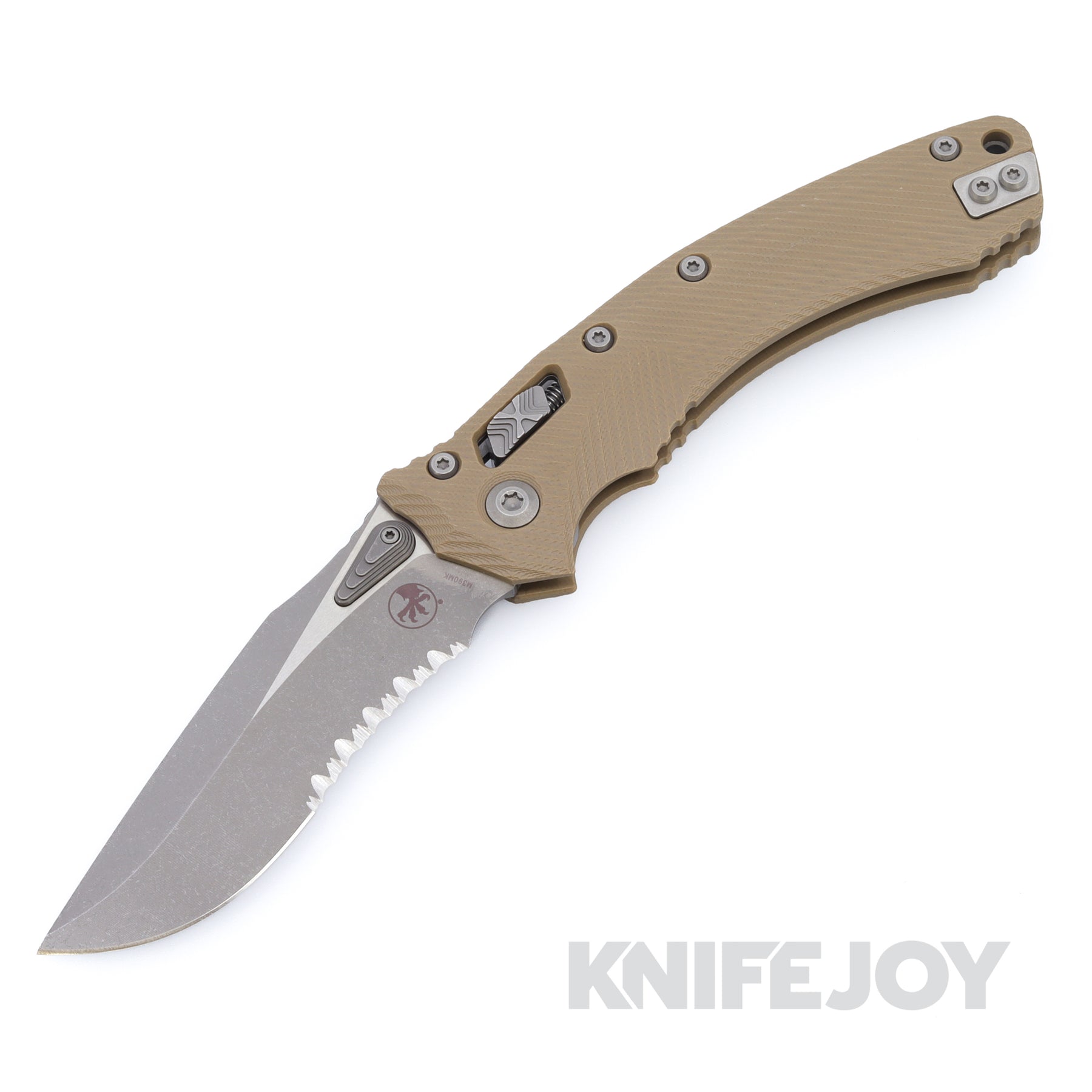 MICROTECH 137RL-11APFLGTTA Amphibian RAM-LOK Folder brings the Amphibian platform into a modern manual configuration with Microtech’s RAM-LOK crossbar system. This version features an apocalyptic-finished clip point blade with partial serrations and fluted tan G10 handles. The result is a full-size folder built for hard use with a balanced, work-ready profile.