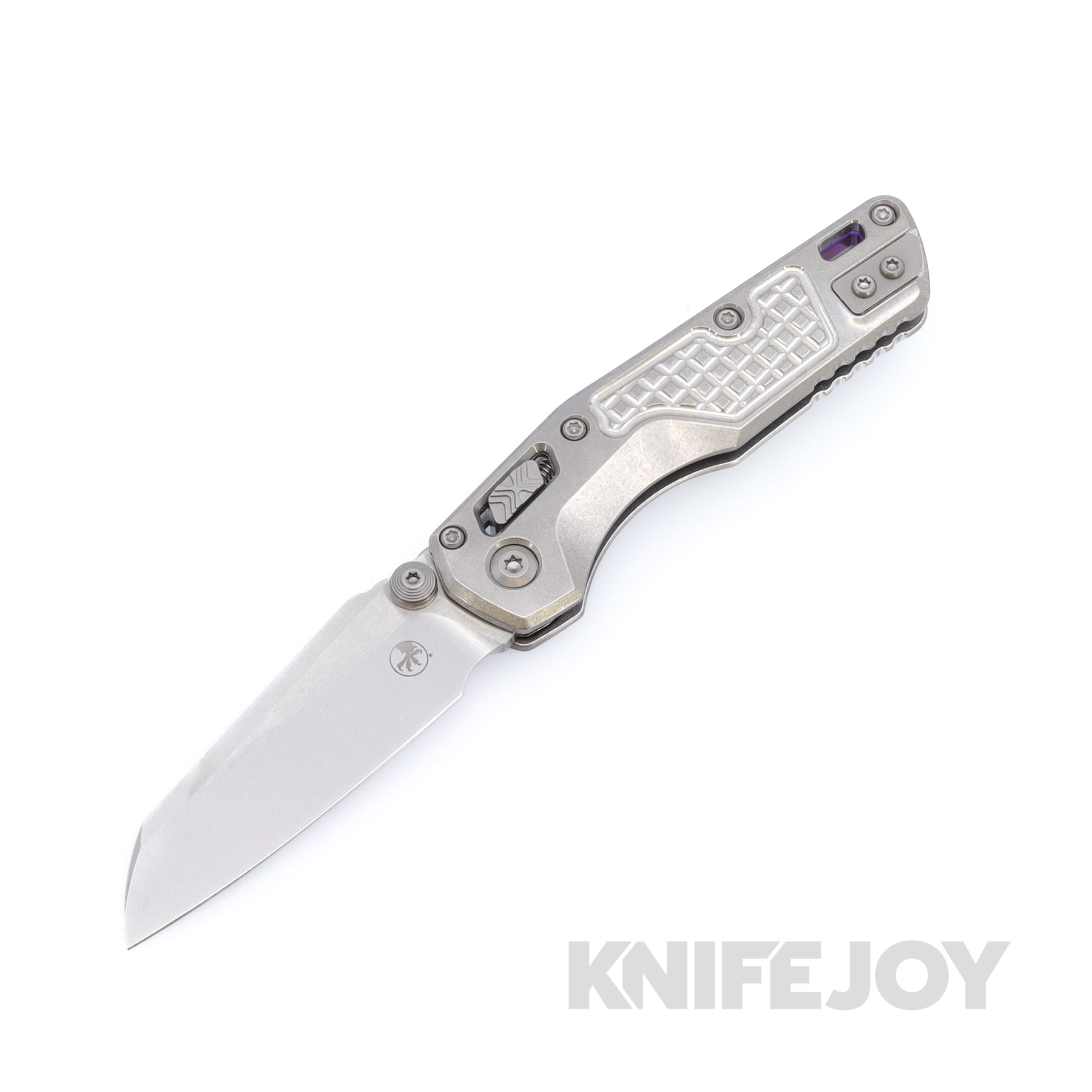 MICROTECH 210M-10FRMS4 MSI Mini RAM-LOK Marfione Select Folder Single Edge Stonewash Standard Blade with Stonewash Frag Titanium Handles and Purple Titanium Accents