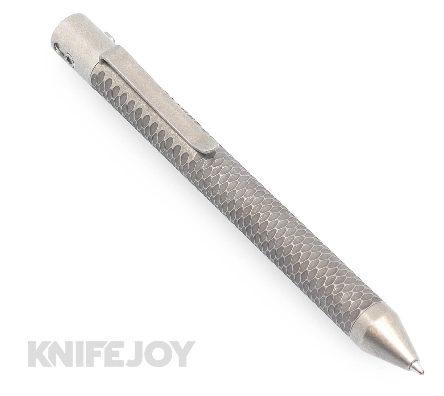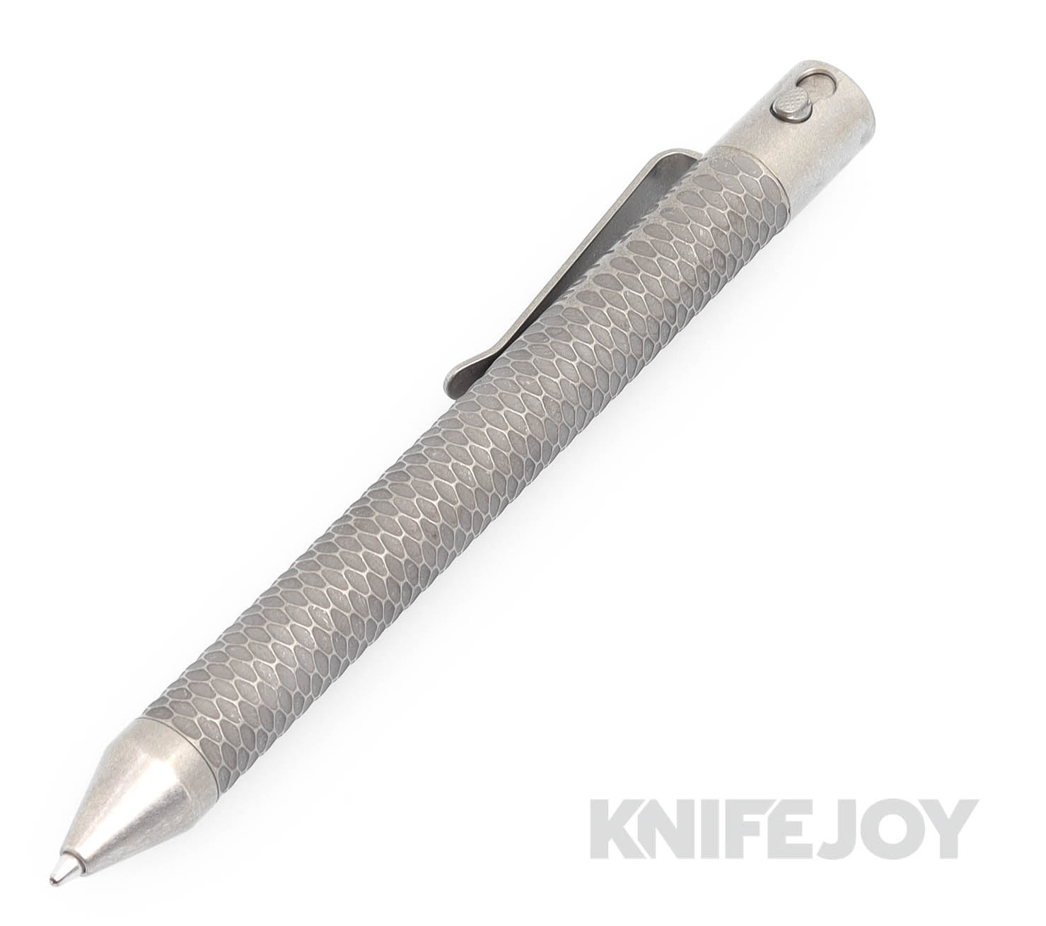 This is our newest design in our award winning {patent pending} ballpoint ink pen line. All of our pens are completely machined and built in house, including the mechanism. The TiButton was created and mastered over a two year period. In that time, we manufactured four variations of the TiButton mechanism; Right or Left Handed and Single or Double Locking, allowing you to choose the pen that is perfect for you!