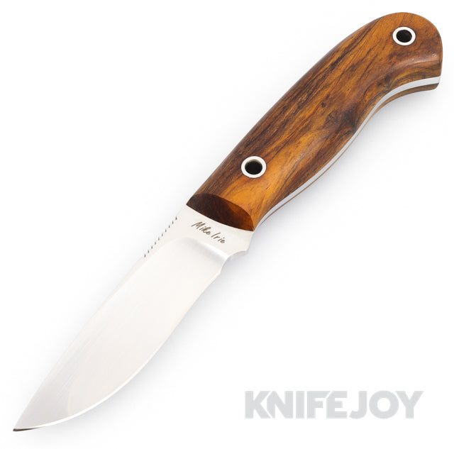 Mike Irie is known for his Hand Ground Polished Blades so much so that many companies seek him out to grind special editions of various models.  This fixed blade is a model that Mr Irie does special, for shows that he attends through the year.  Offered in several handle options and a couple grind styles, it comes with a handmade leather sheath and an extremely reasonable price.