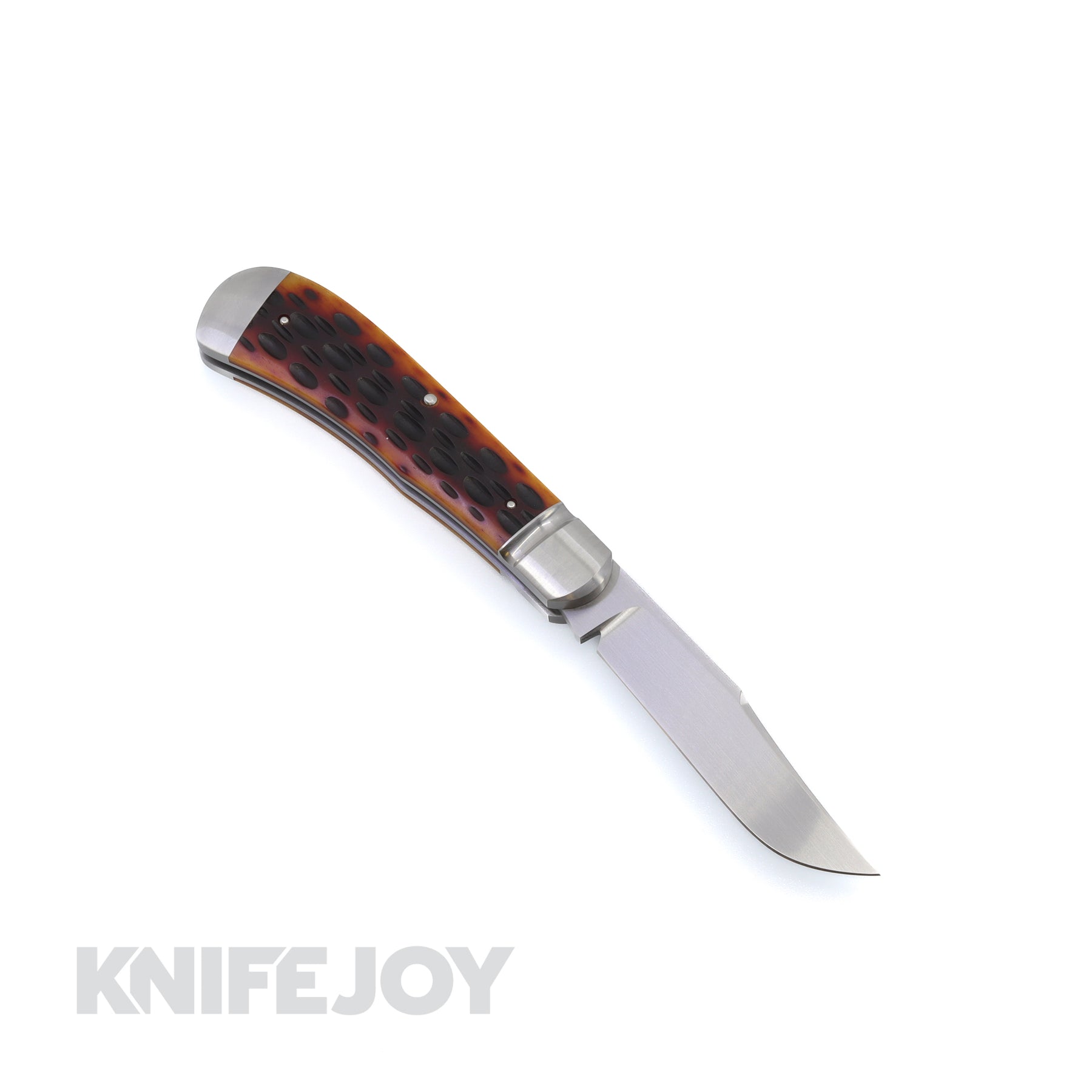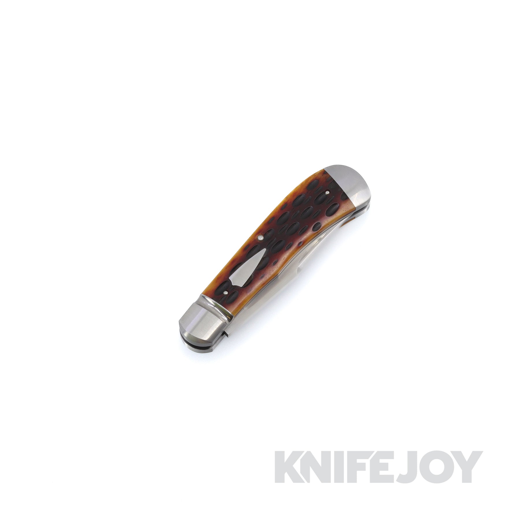 This custom Pena South Texas Trapper is made from amber jigged bone on the scales, and the blade material is CPM154 steel. This is a one-of-a-kind slipjoint.