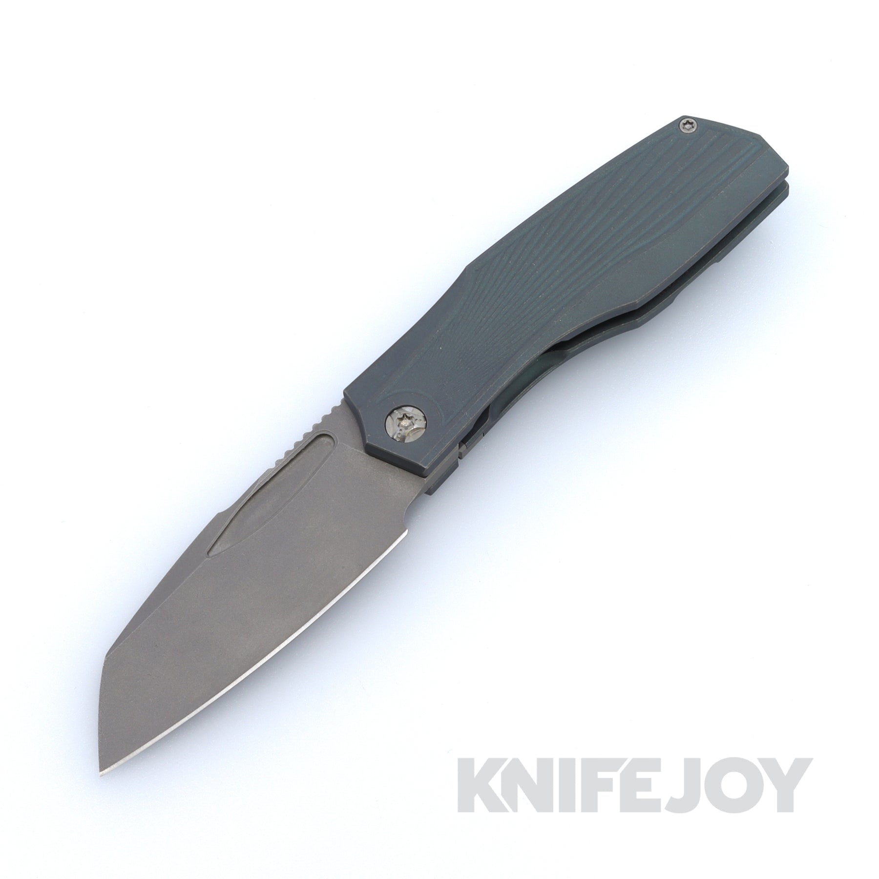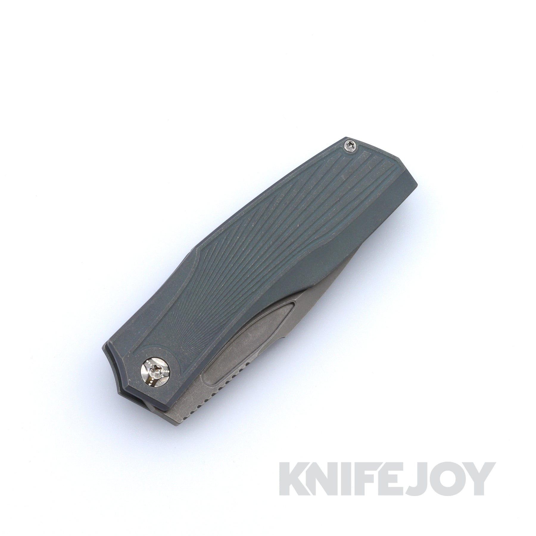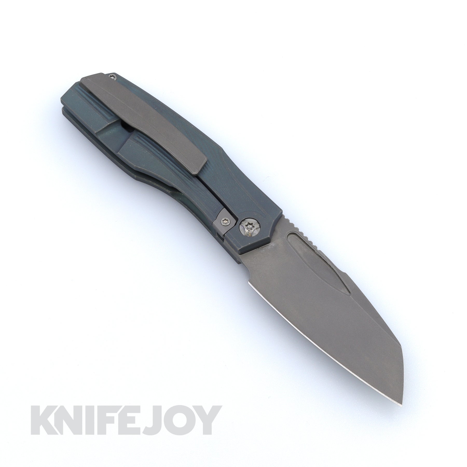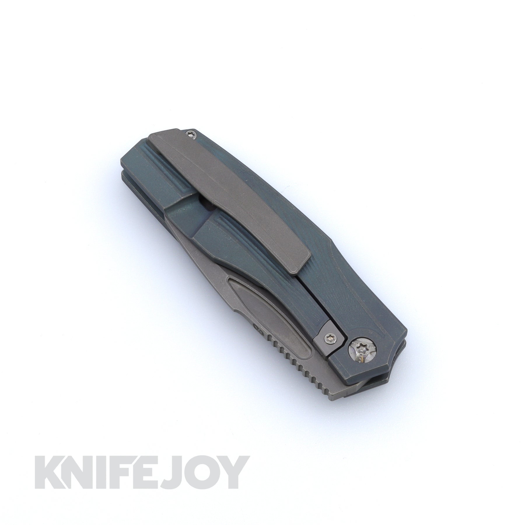 The Protean has a 20CV blade with 3D machined hollow bevel and is heat treated to 61-62 Rc with a blasted and stonewashed finish. With a RWL34 Lockbar insert, the Grade 5 Ti frame has a special texture pattern with blue anodizing. The machined pocket clip and backspacer are blasted and stonewashed. All held together with Grade 5 Ti Hardware Dots & Arcs pivot screws and riding on caged ceramic bearings running on hardened steel thrust washers.
