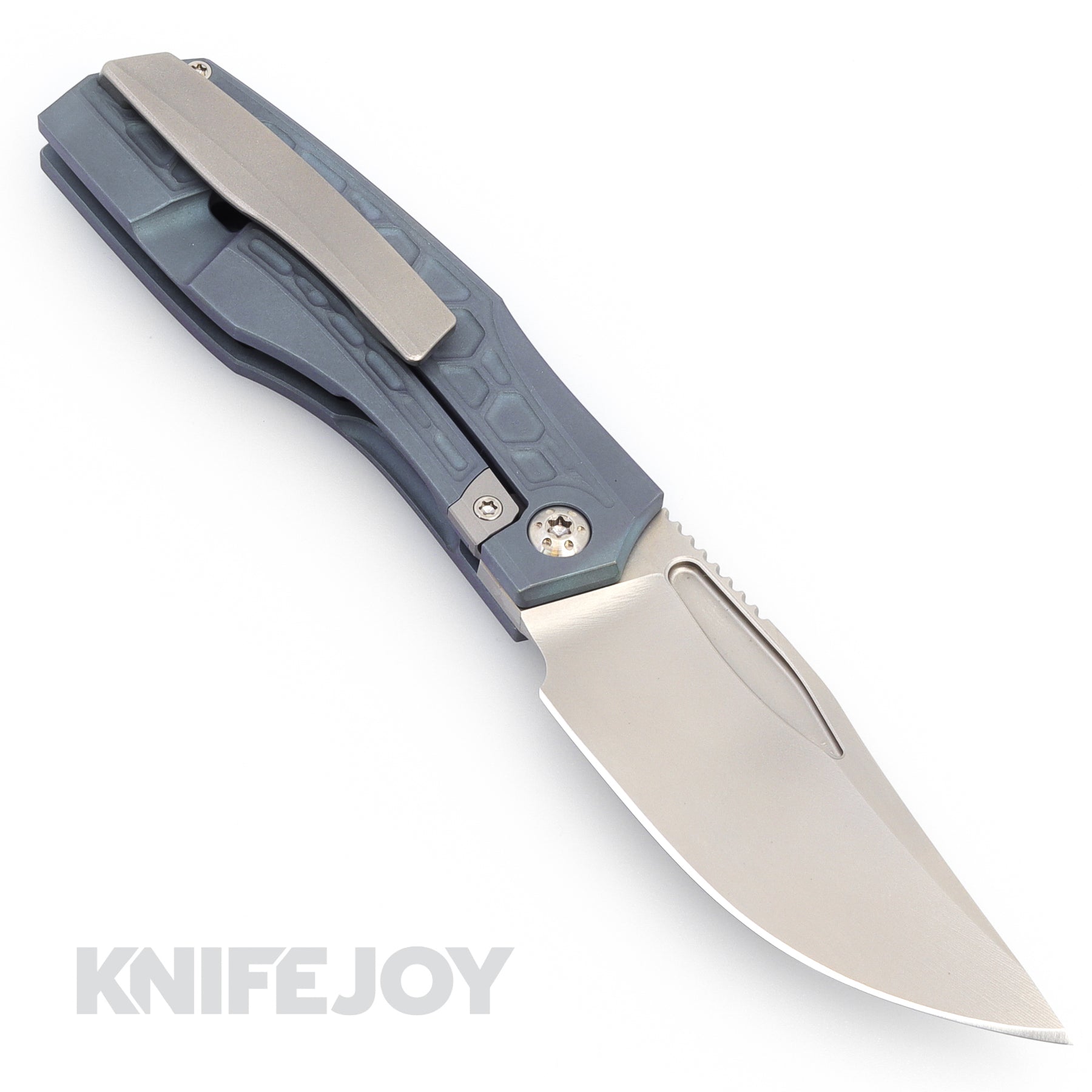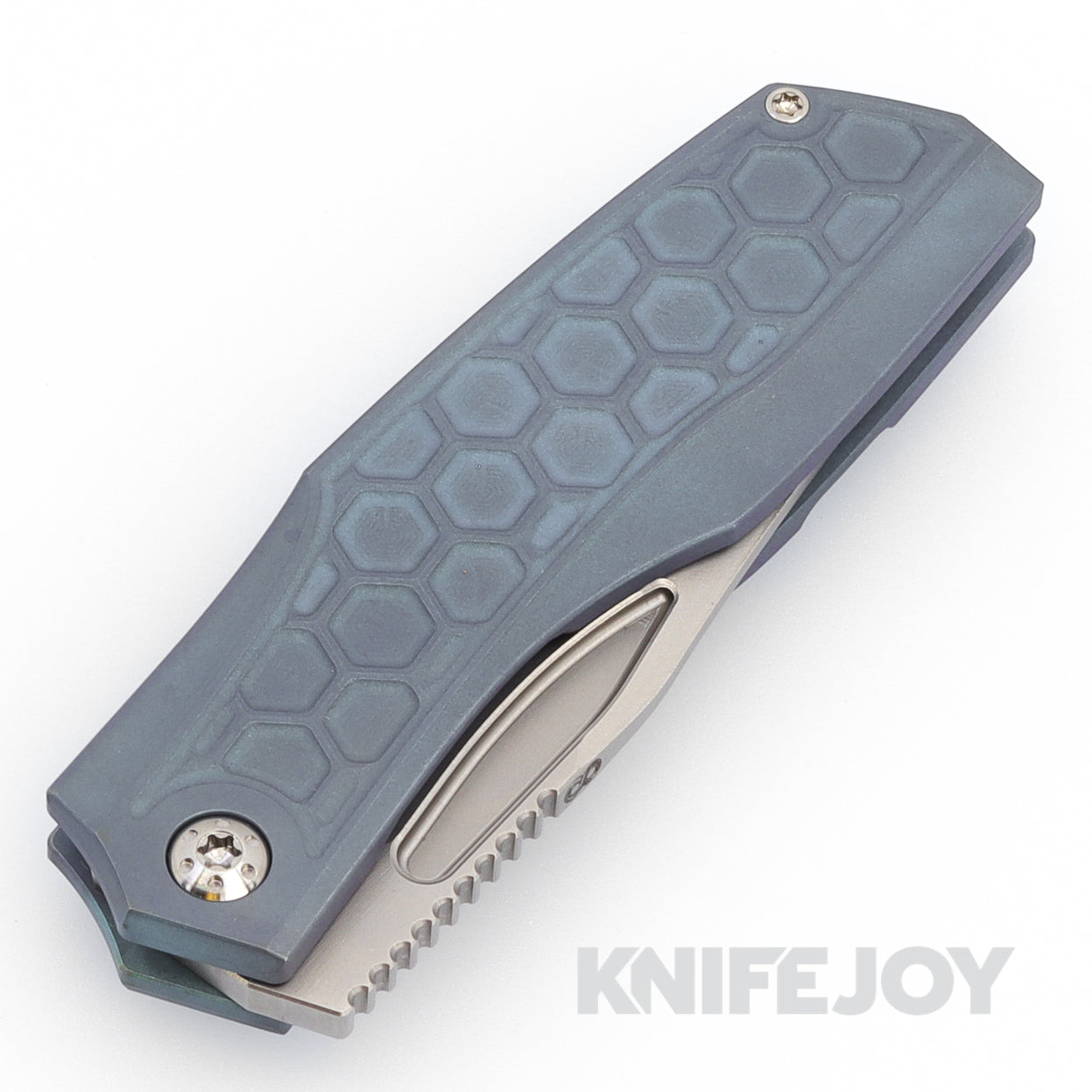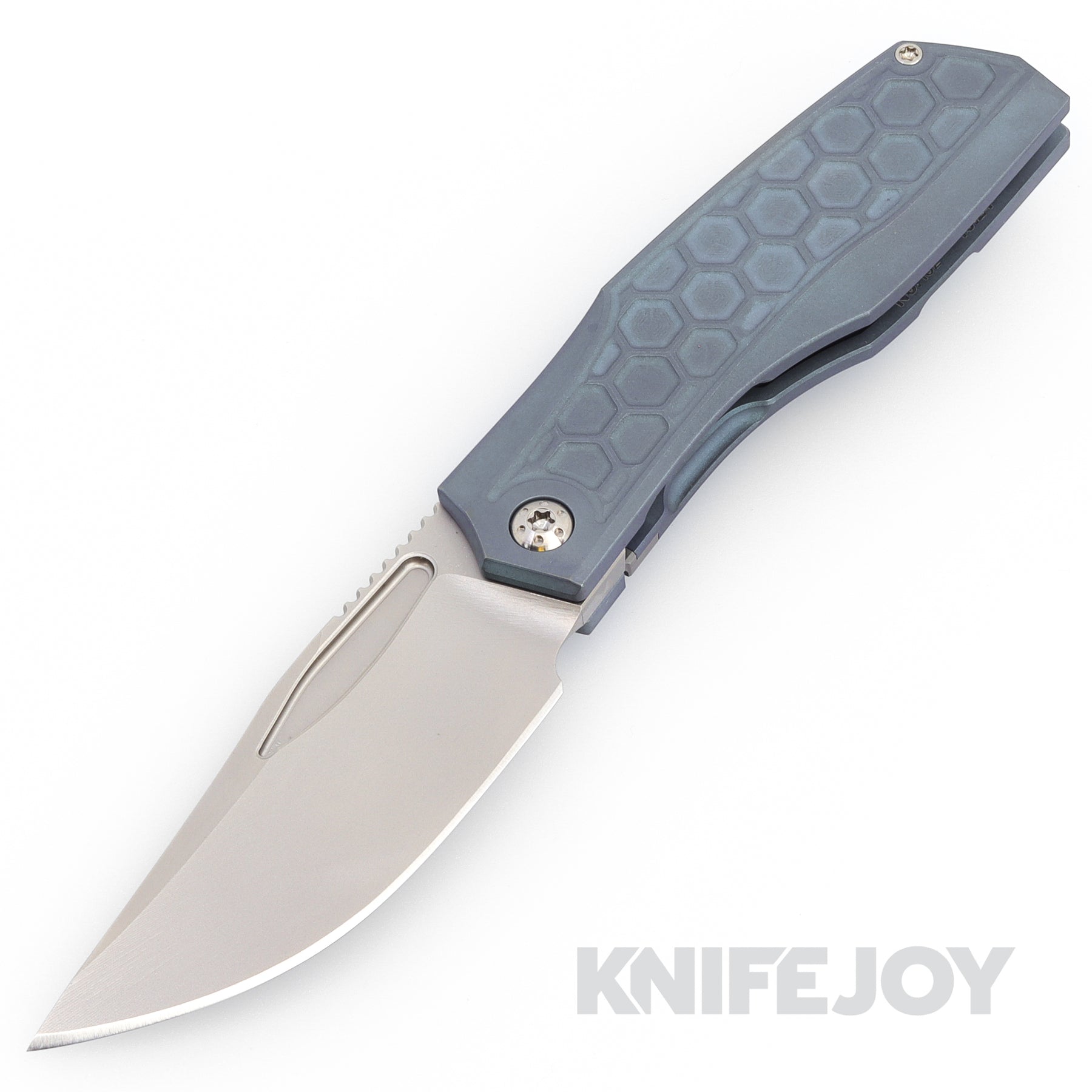 The Protean has a 20CV Blade with 3D machined hollow bevel and is heat treated to 61-62 Rc with a blasted and stonewashed finish. With a RWL34 Lockbar insert, the Grade 5 Ti frame has a special honeycomb pattern with blue anodizing. The machined pocket clip and backspacer are blasted and stonewashed. All held together with Grade 5 Ti Hardware Dots & Arcs pivot screws and riding on caged ceramic bearings running on hardened steel thrust washers.