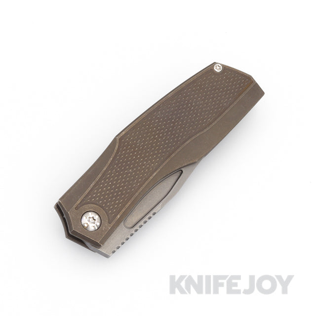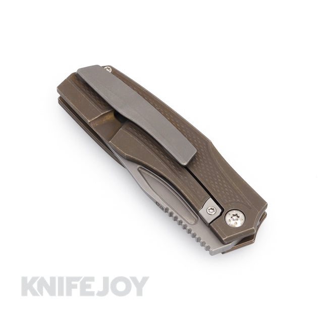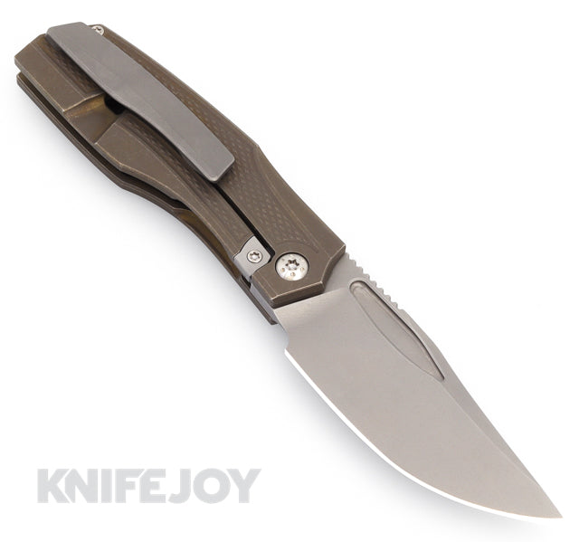 The Protean has a Magnacut Blade with 3D machined hollow bevel with a blasted and stonewashed finish. With a RWL34 Lockbar insert, the Grade 5 Ti frame has a Machine Knurl Texture Pattern. The machined pocket clip and backspacer are blasted and stonewashed. All held together with Grade 5 Ti Hardware Dots & Arcs pivot screws and riding on caged ceramic bearings running on hardened steel thrust washers.