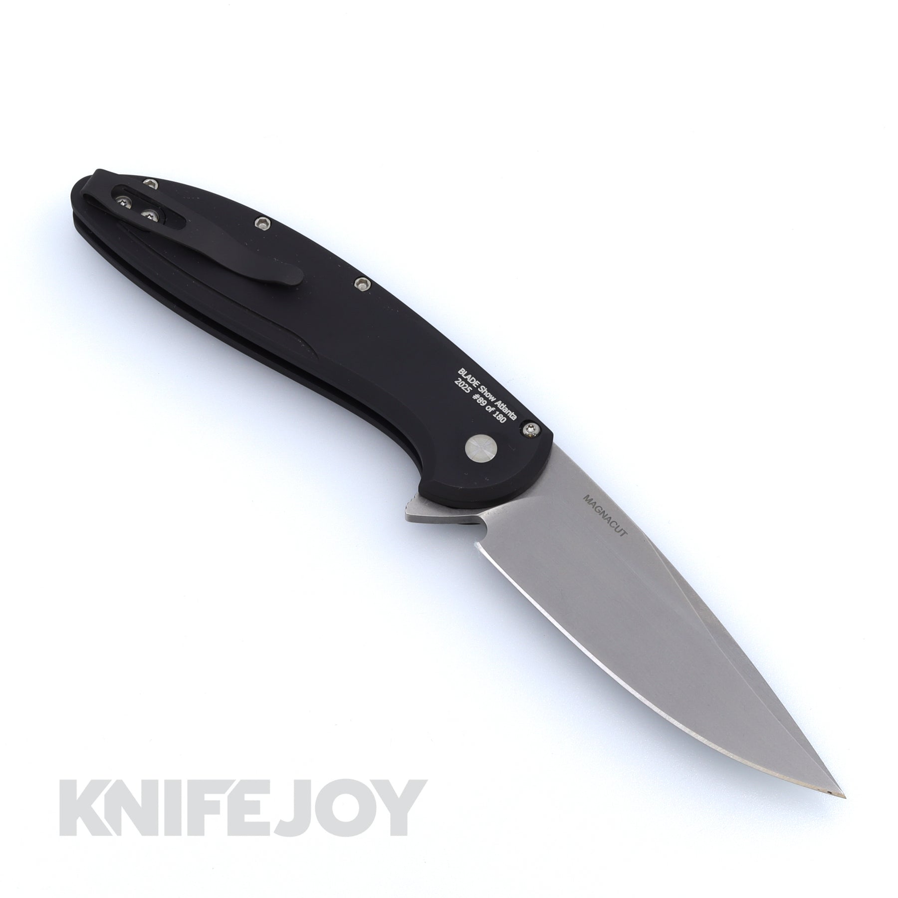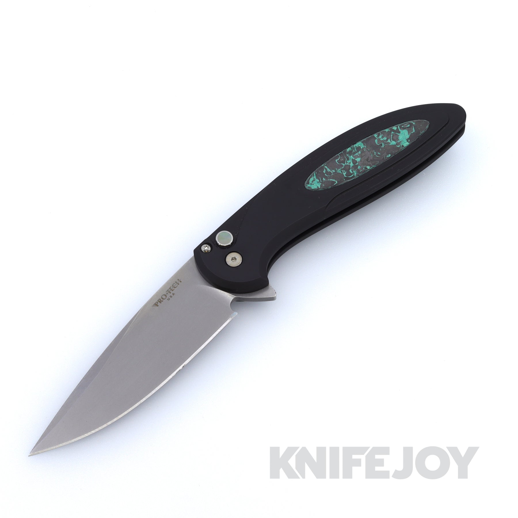 Pro-Tech Knives PT-BSA25.Cambria.1 BLADE Show 2025 Cambria 2 Flipper with Stonewash Magnacut Blade and Black Handle with TechnoCarbo Teal Inlay / Black Lip Pearl Button / Satin Hardware