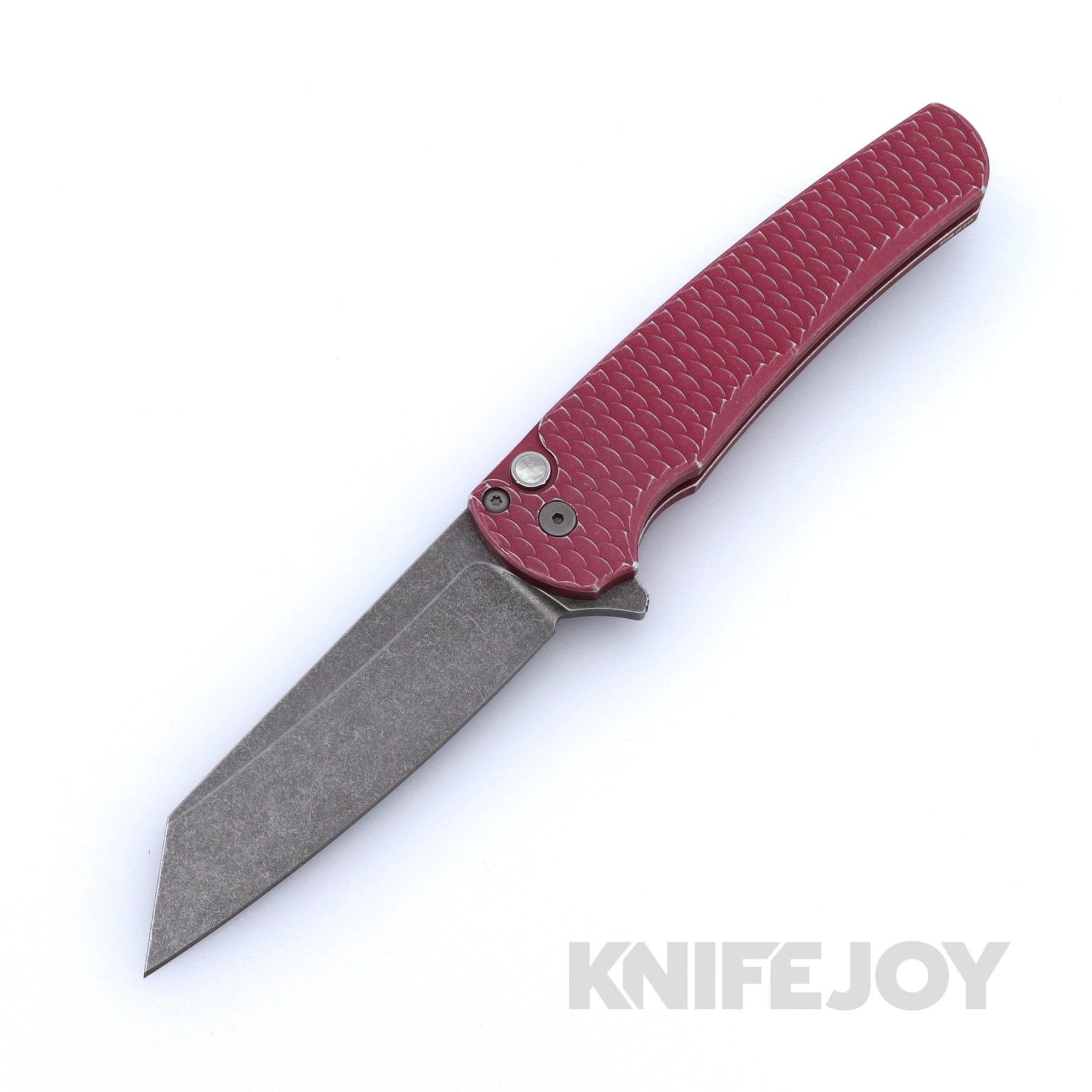 Pro-tech Knives PTBSA25.Malibu.1 BLADE Show 2025 Malibu Flipper Acidwash Magnacut Reverse Tanto Blade with Battleworn Red Dragon Scale Handles / Black Lip Pearl Button / Black Hardware and Clip