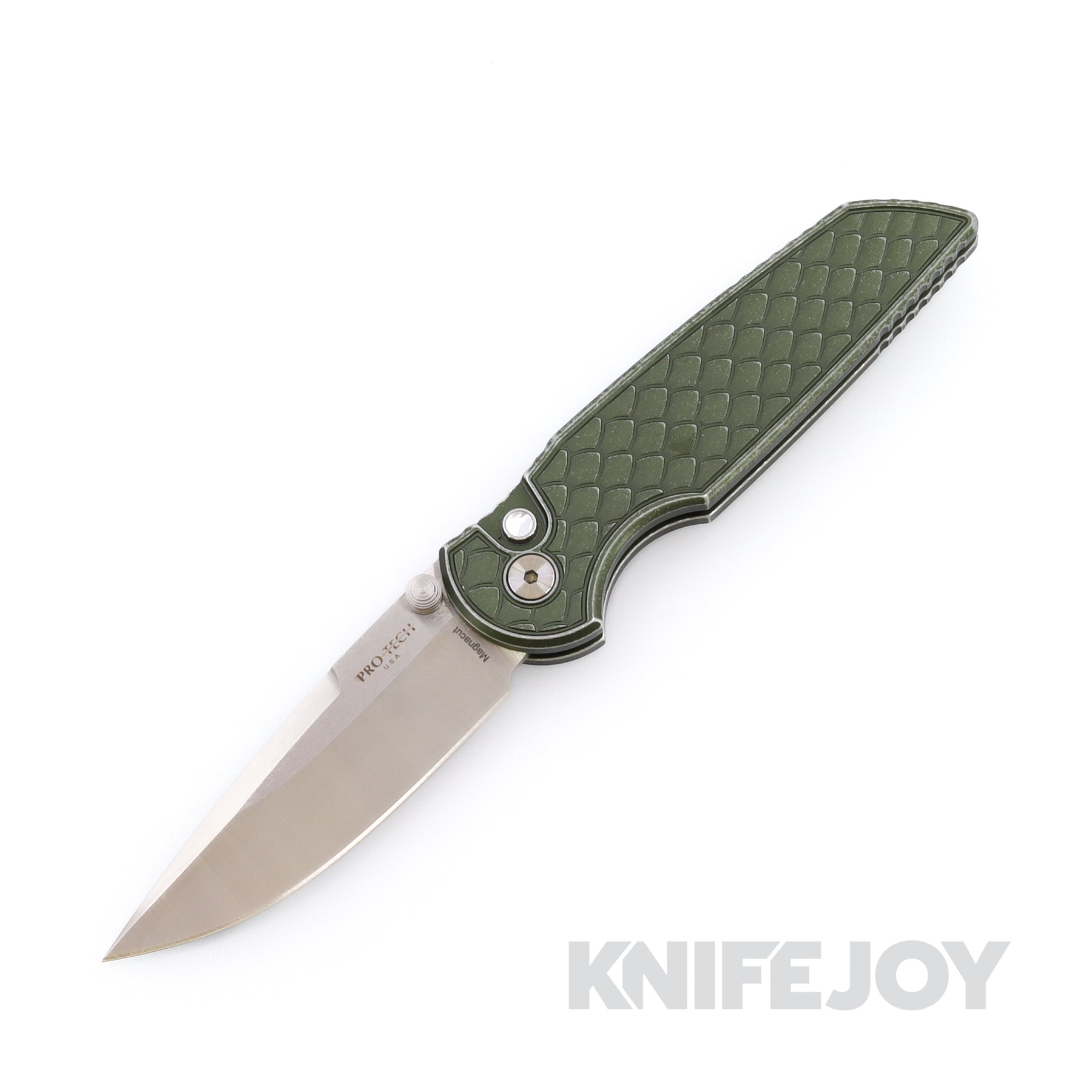 Pro-tech Knives Tactical Response 3 Integrity Double Thumbstud Manual Machine Satin Magnacut Blade with Battleworn Reptile Textured Green Handle and Satin Hardware with a Pearl Button