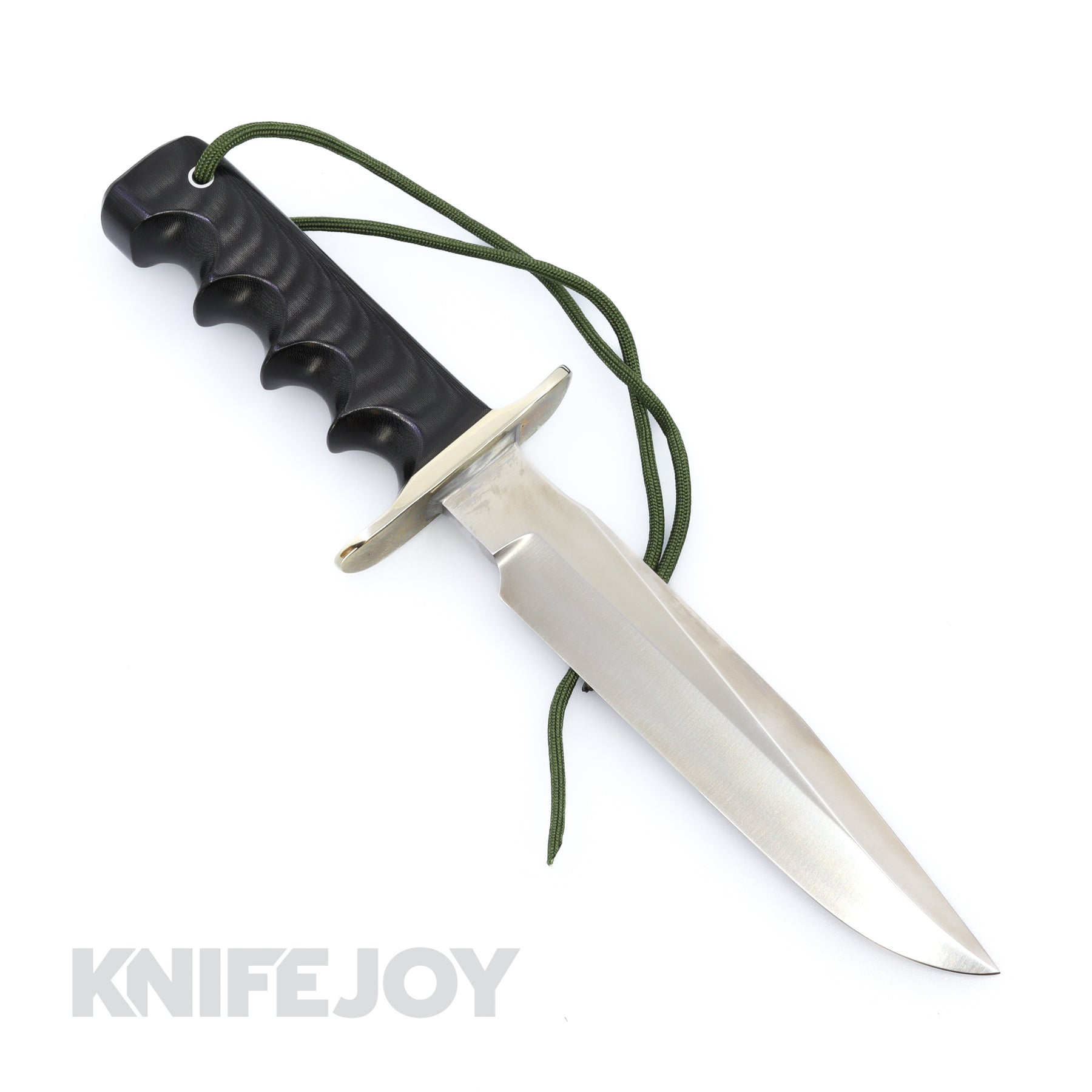 7″ blade of 1/4″ stainless steel stock. The top cutting edge is sharpened approximately 3″. nickel double hilt. Approximately 4 1/2″ durable black Micarta finger grip handle. Extra-heavy 7/8″ wide tang extends through a channel in the handle, which is firmly fastened with epoxy. Wrist thong through brass ferrule in the handle. Waxed Leather Sheath