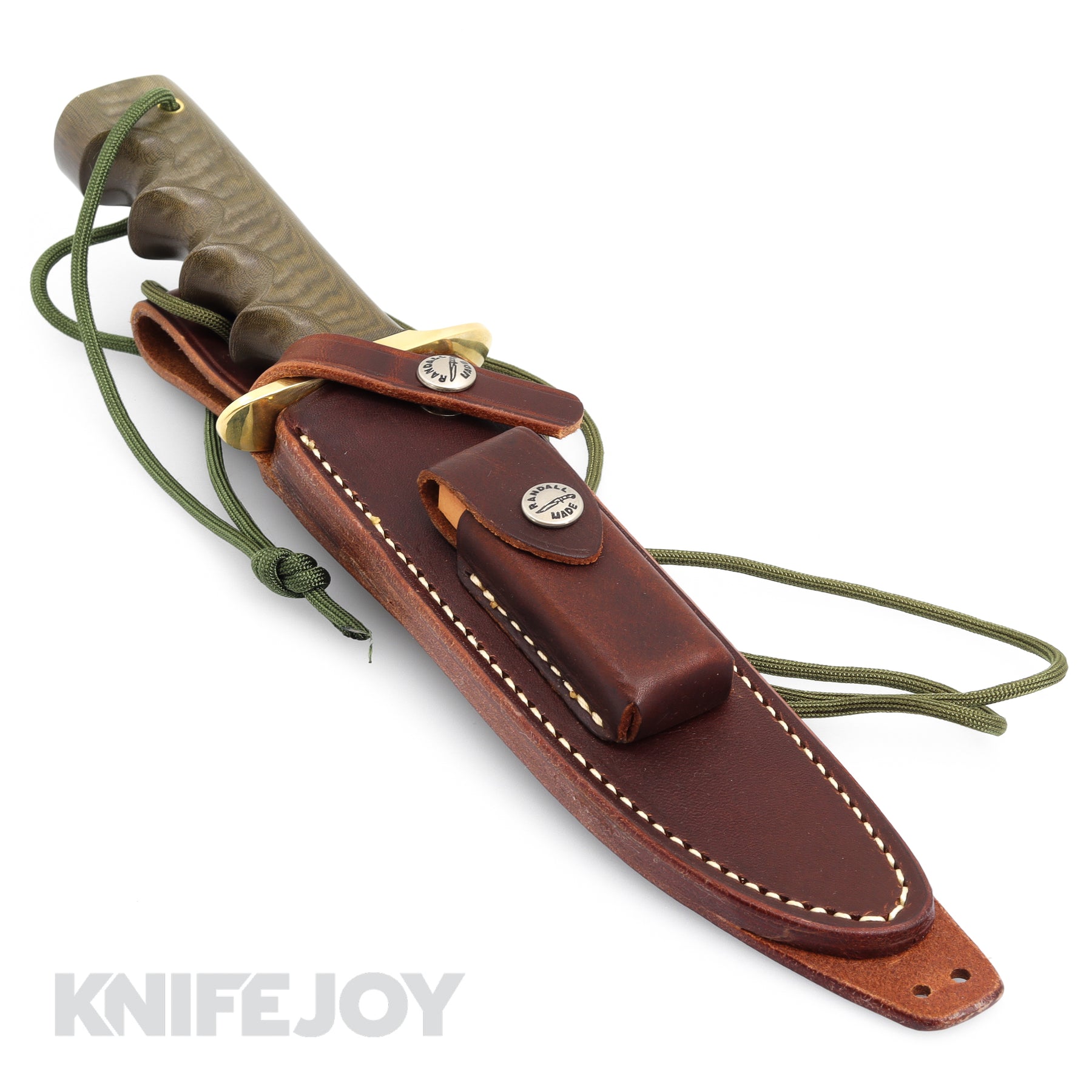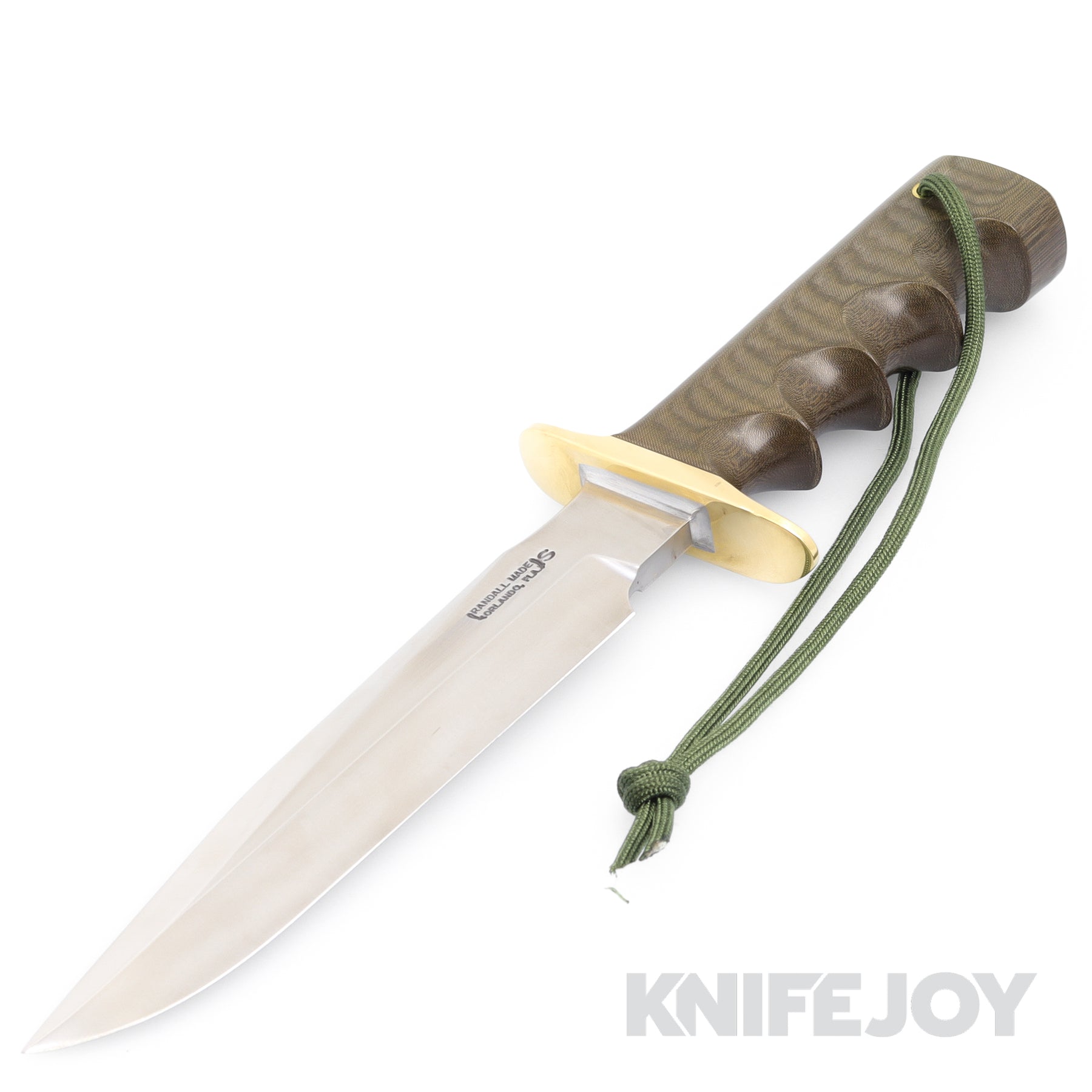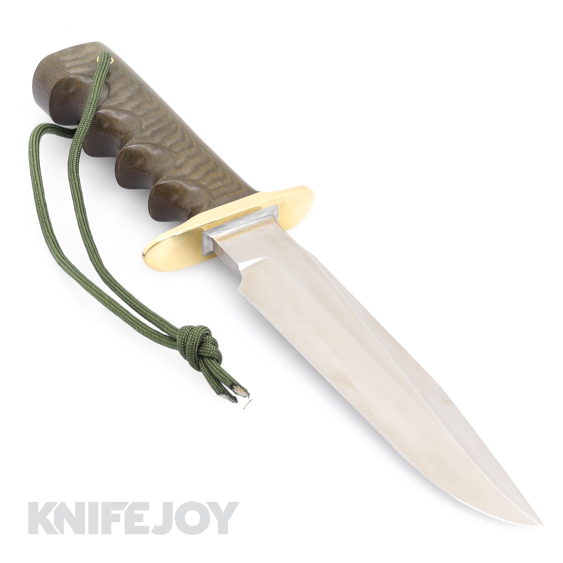 7″ blade of 1/4″ stainless steel stock. The top cutting edge is sharpened approximately 3″. Brass double hilt. Approximately 4 1/2″ durable Green Micarta finger grip handle. Extra-heavy 7/8″ wide tang extends through a channel in the handle, which is firmly fastened with epoxy. Wrist thong through brass ferrule in the handle.