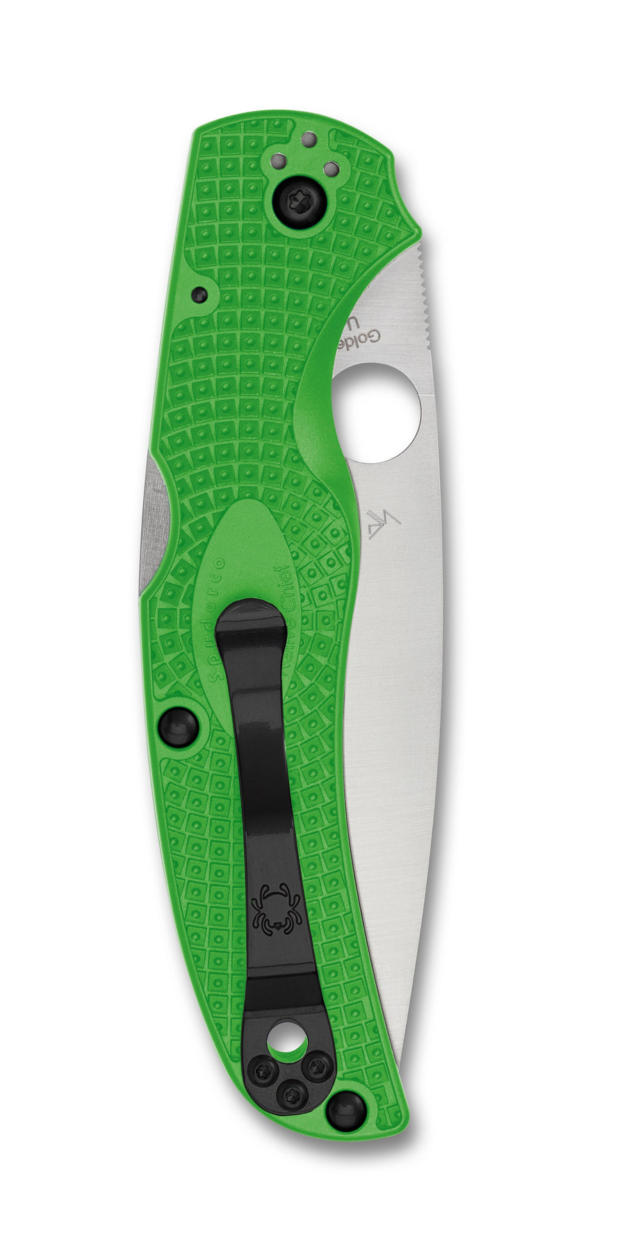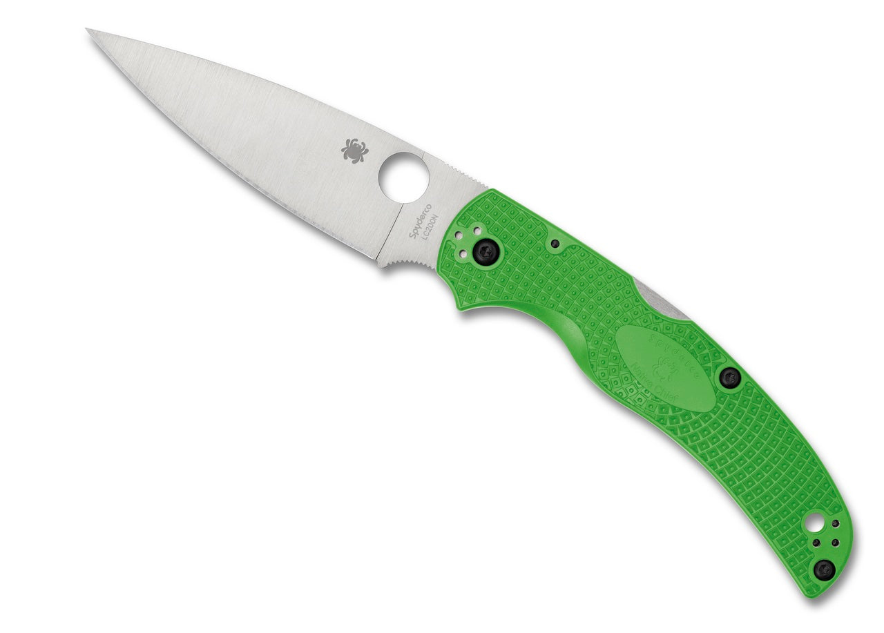 Twenty-one percent lighter than its G-10- handled counterpart, the Native Chief Lightweight features fiberglass-reinforced-nylon (FRN) handle scales and high-traction Bi-Directional Texturing. Those qualities made it an ideal candidate for inclusion in Spyderco’s remarkable Salt Series. This Native Chief Lightweight Salt showcases a full-flat-ground blade precision machined from ultra-corrosion-resistant LC200N steel, best known as NASA’s material of choice for ball bearings in spacecraft. Available in both PlainEdge and fully serrated SpyderEdge formats, the blade is paired with a linerless handle injection molded in the signature high-visibility green color of our LC200N lightweight Salt family. The vibrant handle also houses the knife’s sturdy back lock mechanism and includes four sets of threaded inserts to allow fully configurable mounting of a four-position pocket clip.
