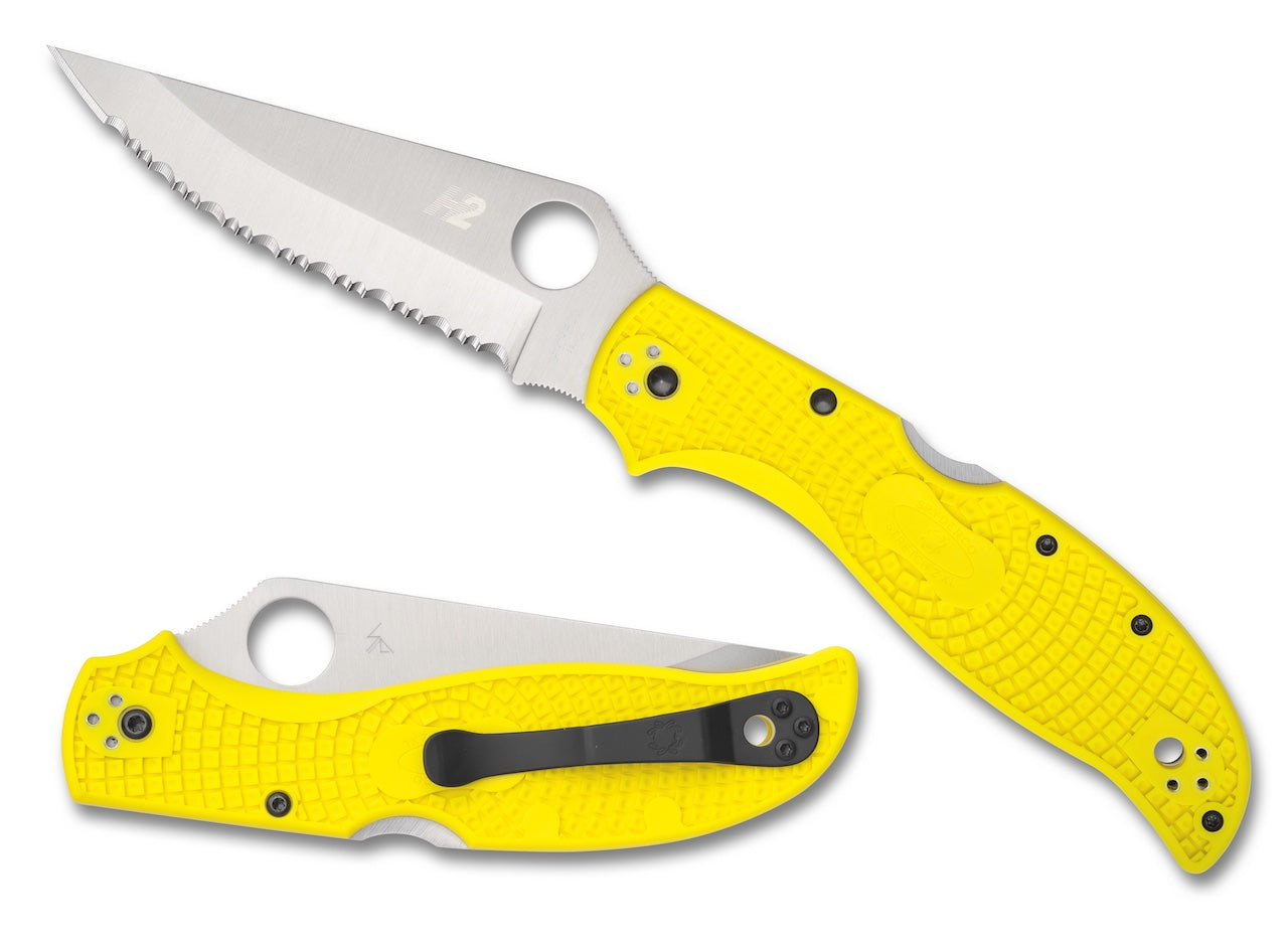 The Stretch 2 XL Lightweight represents more than three decades of evolution that began with Spyderco’s classic folding hunting knives. Through years of relentless refinement, we have arrived at a full-sized, full-service cutting tool that is incredibly lightweight and easy to carry. So what could possibly make it better? How about crafting it with a fearlessly corrosion-resistant blade steel and making it a member of our elite Salt Series? Tipping the scales at a mere 3.0 ounces (84 grams), the Salt 2 XL Lightweight Salt is the largest folding knife in our Salt lineup. Its 3.95-inch (100mm) blade is hollow-ground from ultra-corrosion-resistant H-2 steel and available in a choice of PlainEdge or fully serrated SpyderEdge formats. The blade is supported by a sturdy back lock mechanism housed in a lightweight fiberglass-reinforced-nylon (FRN) handle. Injection molded in a bright yellow color for high visibility, the handle features a non-slip Bi-Directional Texture pattern for optimal grip security and a fully configurable fourposition pocket clip that supports all possible carry options.