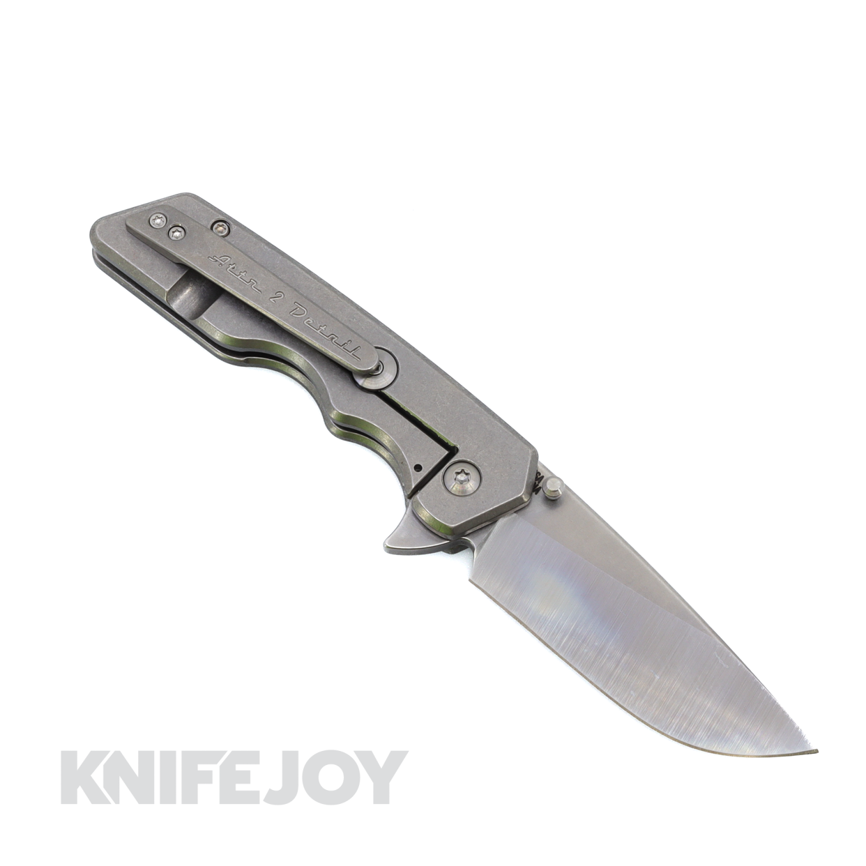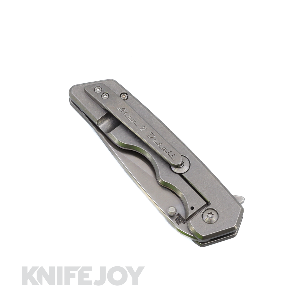 The next evolution from the A2D Custom Shop, this Medium Mark 3 features a hand-ground blade and bevels, a fully machined titanium clip with a brass basketweave insert. Dual opening options with stonewashed hardware.