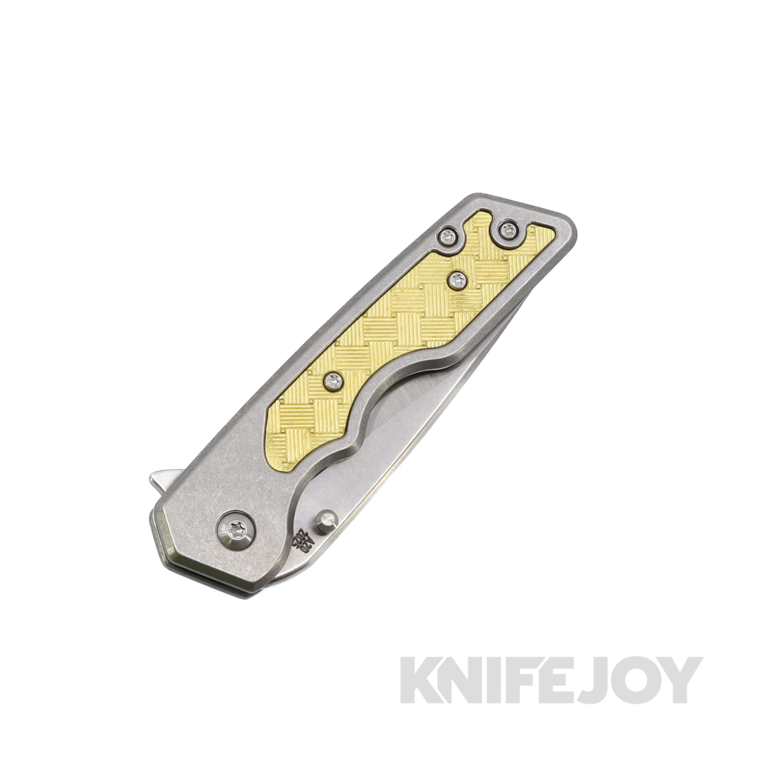 Attn2Detail Mercantile Knives Custom MK3 Medium Two-Tone Magnacut Drop Point Rising Grind Blade with Basket Weave Textured Brass Inlay Titanium Handles