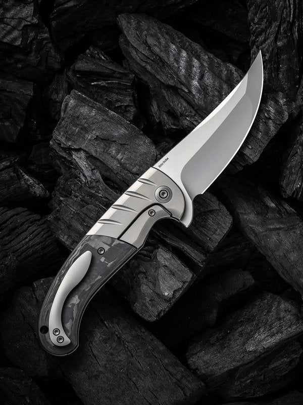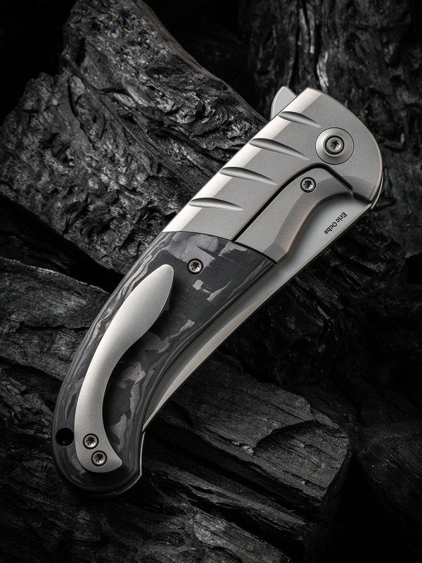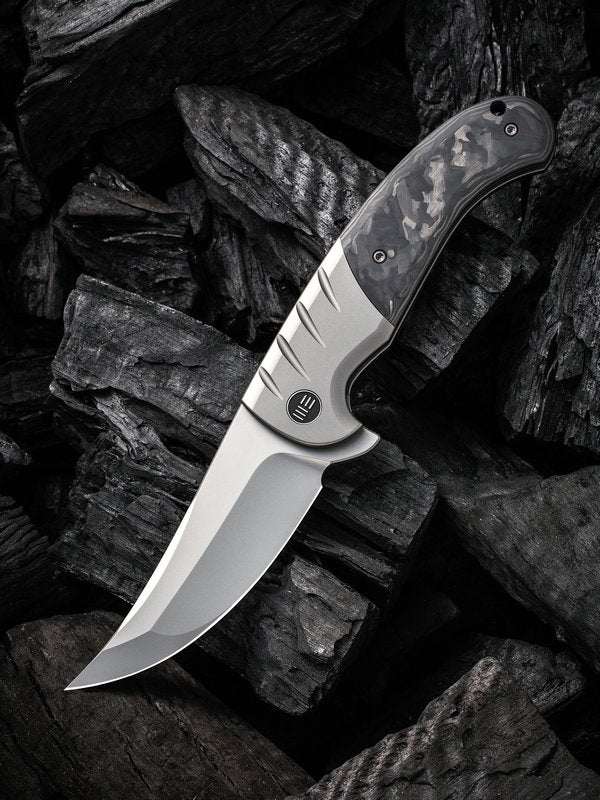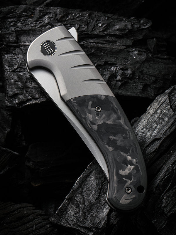 We Knife -20012-1 Curvaceous Gray Titanium Handle/ Marble Carbon Fiber Inlay Flipper with Silver Bead Blasted Blade