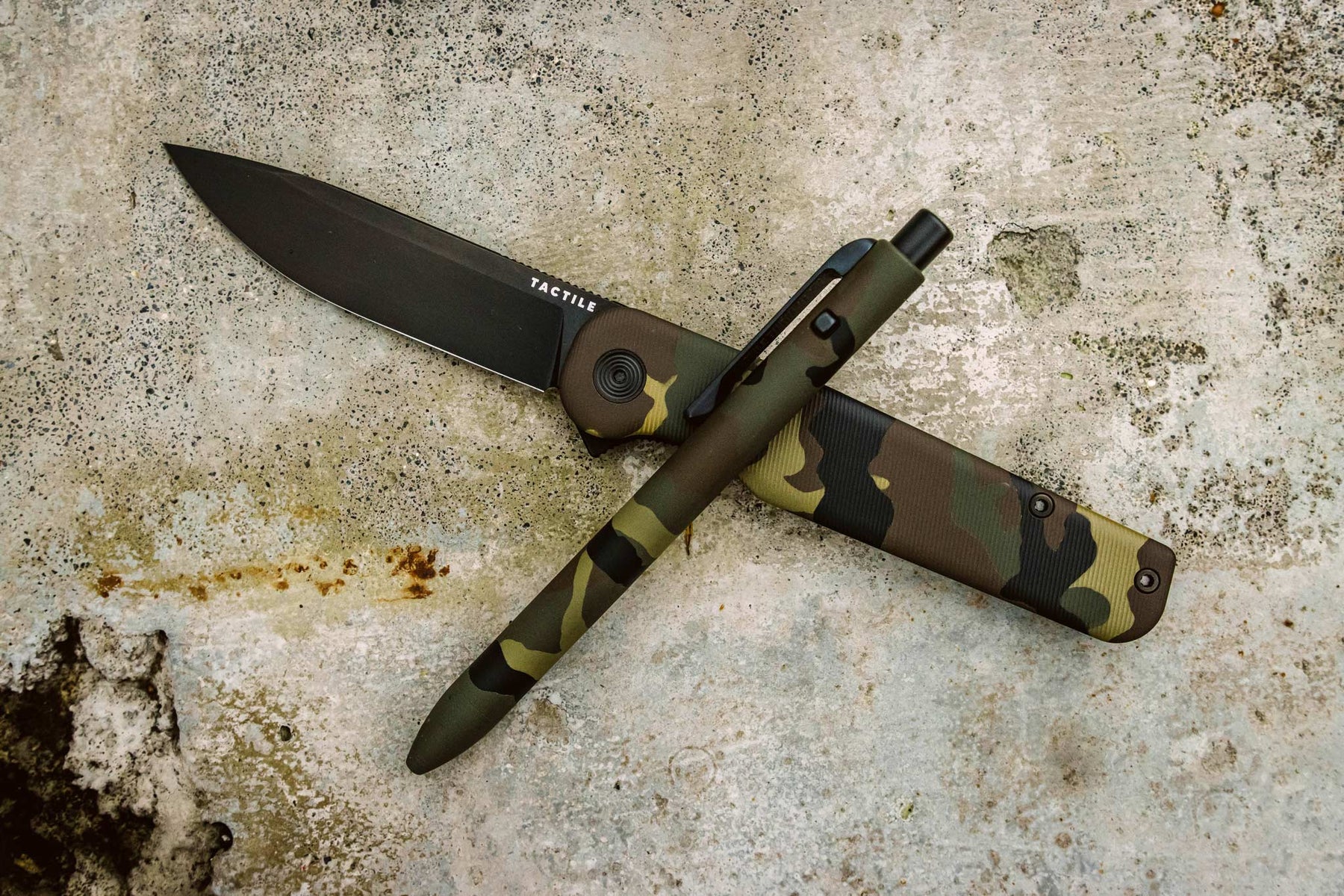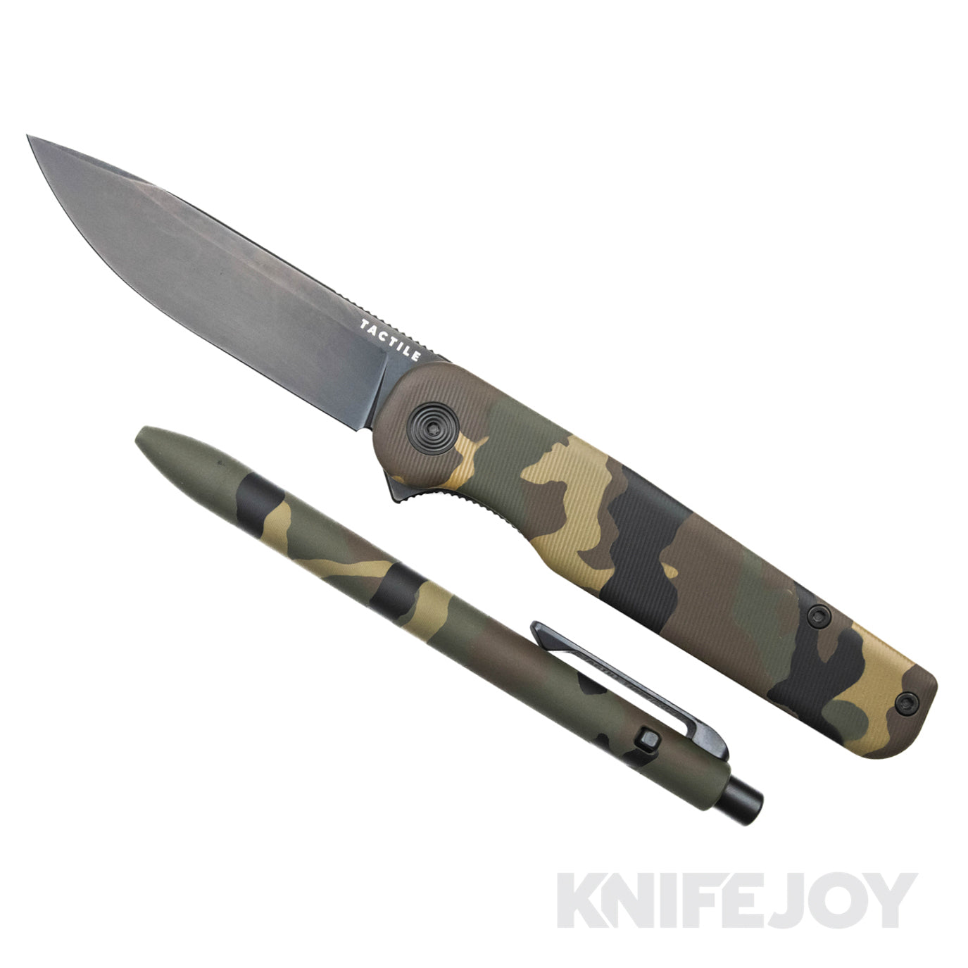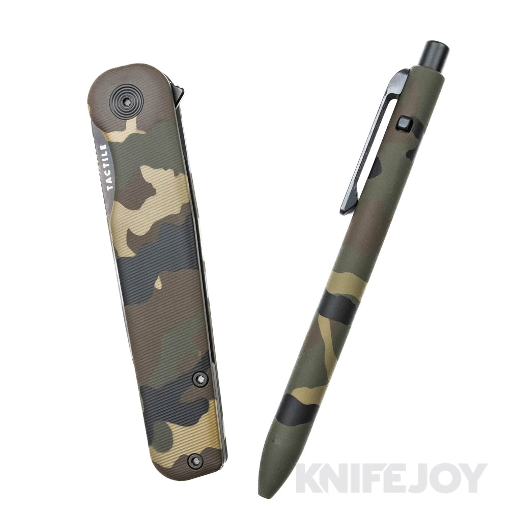 Built for those who appreciate precision, durability, and design consistency, this KnifeJoy Exclusive bundle pairs two standout pieces from Tactile Turn and Tactile Knife Co.—both finished in a striking M81 Camo Cerakote.