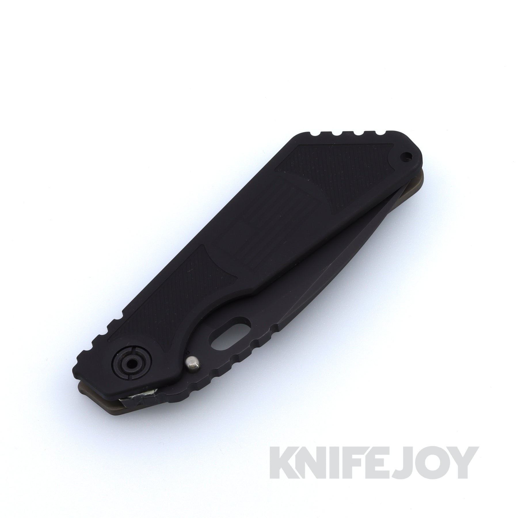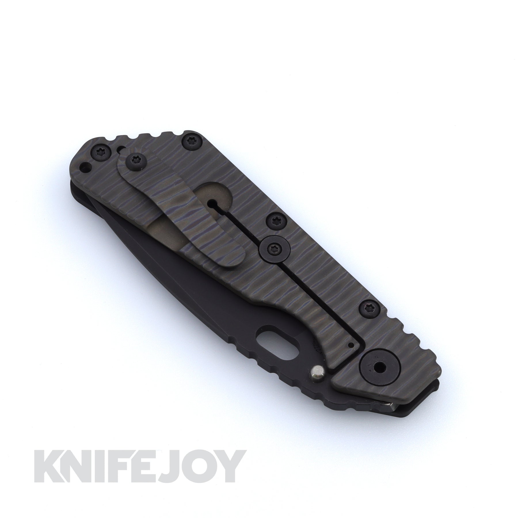 This SMF by Strider has a black blade with a Full Flat Grind and Top Swedge. The Handle is in the OG configuration of flag-engraved Aluminum and Striped Titanium
