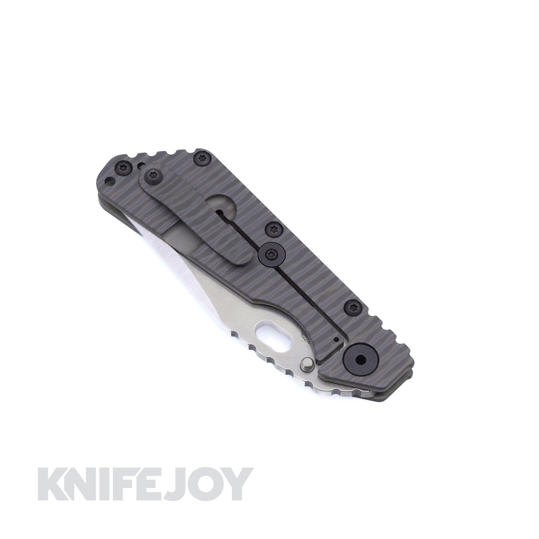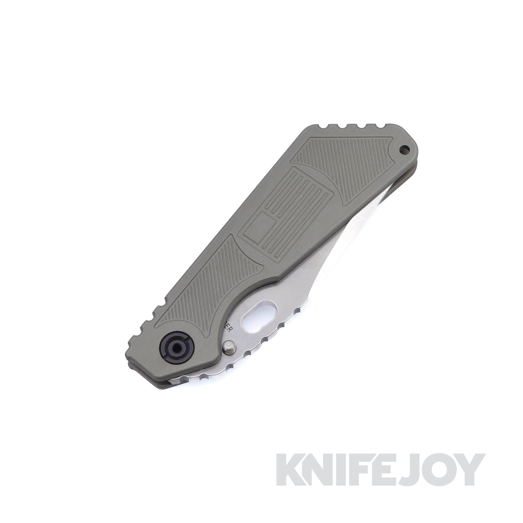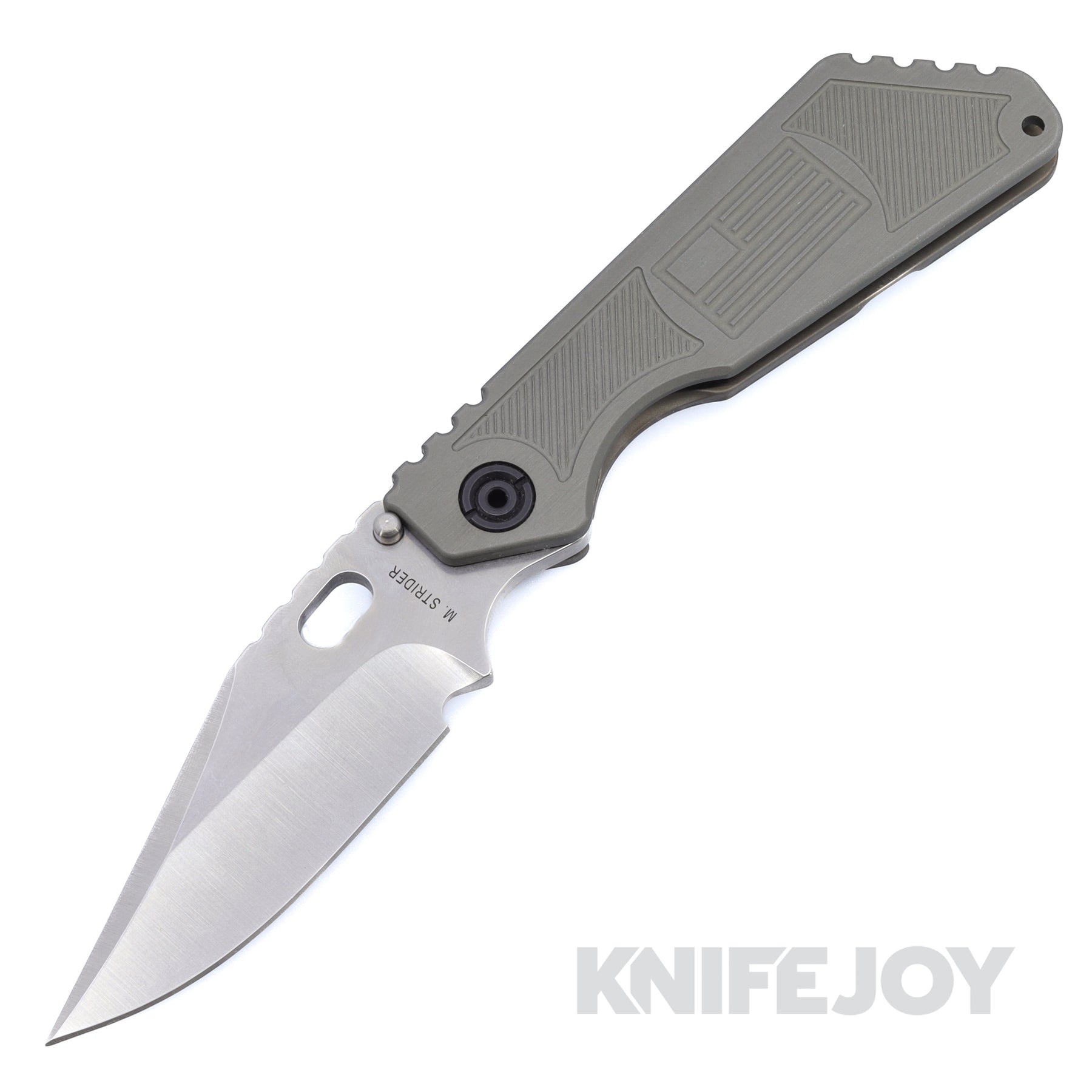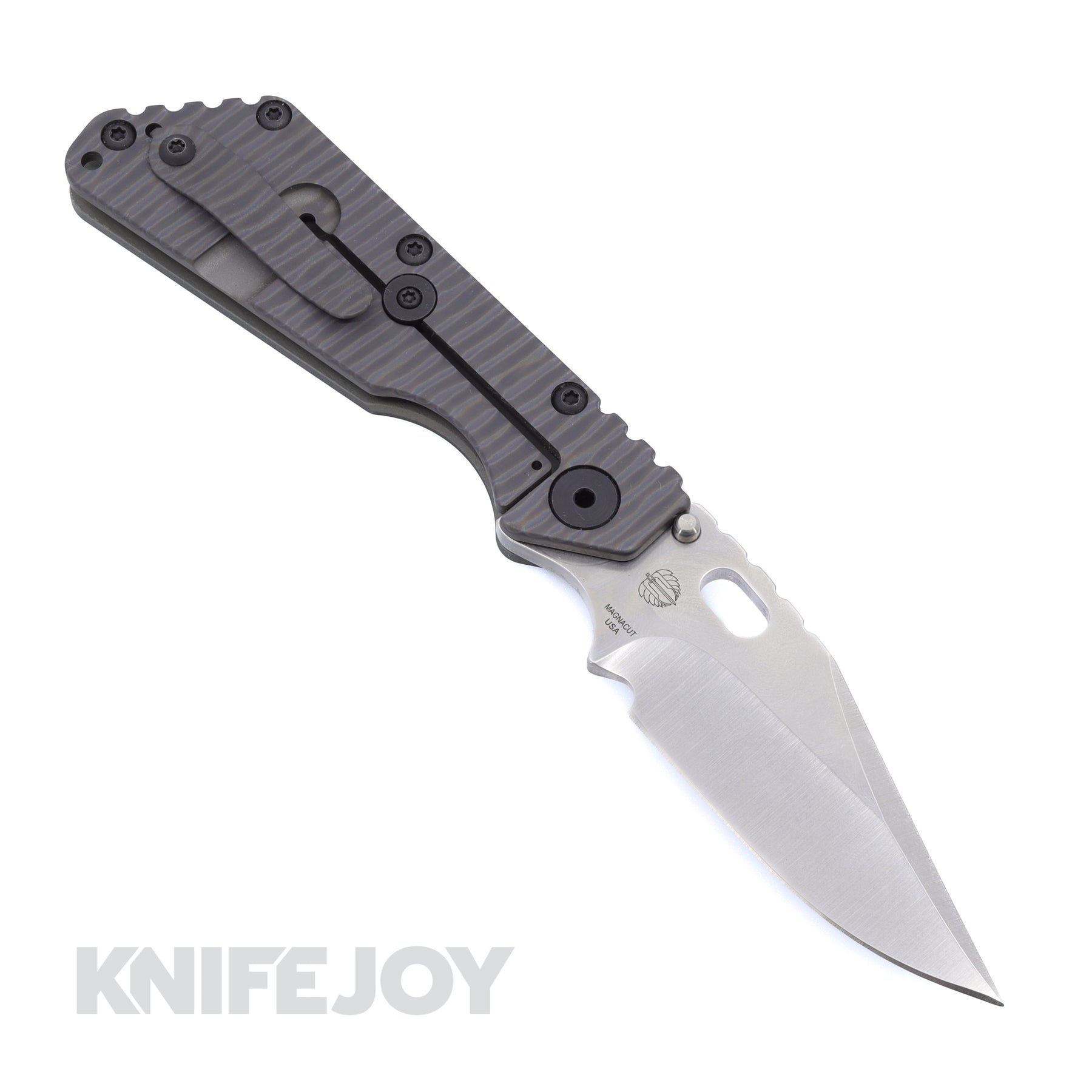 This SMF by Strider has a Satin Finished Hollow Hand Grind Bowie Blade in MAGNACUT Steel. The Handle is the Flag-engraved Aluminum show side and Hand Striped Titanium Lock side