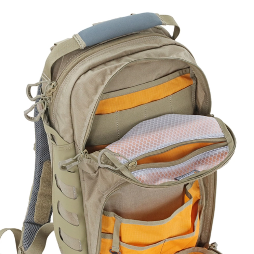 The outer top pocket has a zippered compartment, elastic webbing organization, a slip pocket, and a hook-and-loop field for ID patches. Two Hypalon MOLLE-Air side panels lets you attach our HYDRA Water Bottle Holder or single channel MOLLE accessories.