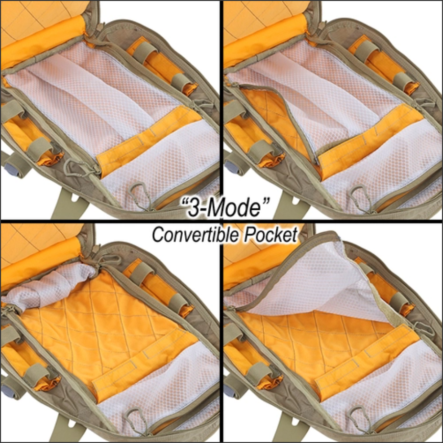 Opposite to the padded sleeve, you’ll find zippered pocket on top, and a “3-Mode” convertible pocket on the bottom. The “3-Mode” convertible pocket can be opened from its left or right zipper, and has a flap top closure. The “3-Mode” pocket can also be rolled-down and stored, revealing a large loop field for more hook-and-loop accessory attachments. There are two side internal pockets with elastic retention for medical gear, knives, or flashlights.